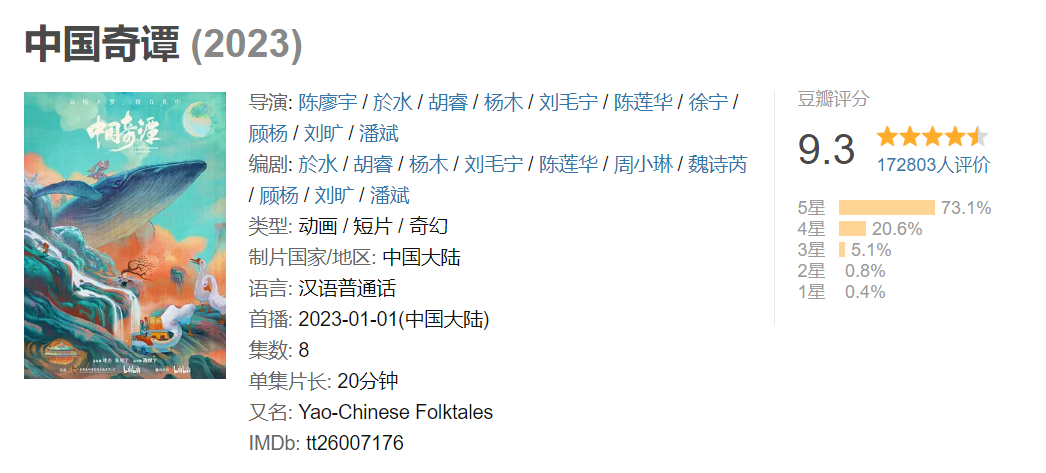 目前,《中国奇谭》经历数日的口碑发酵,播放量已达1.7亿,豆瓣17万人评价获9.3高分。