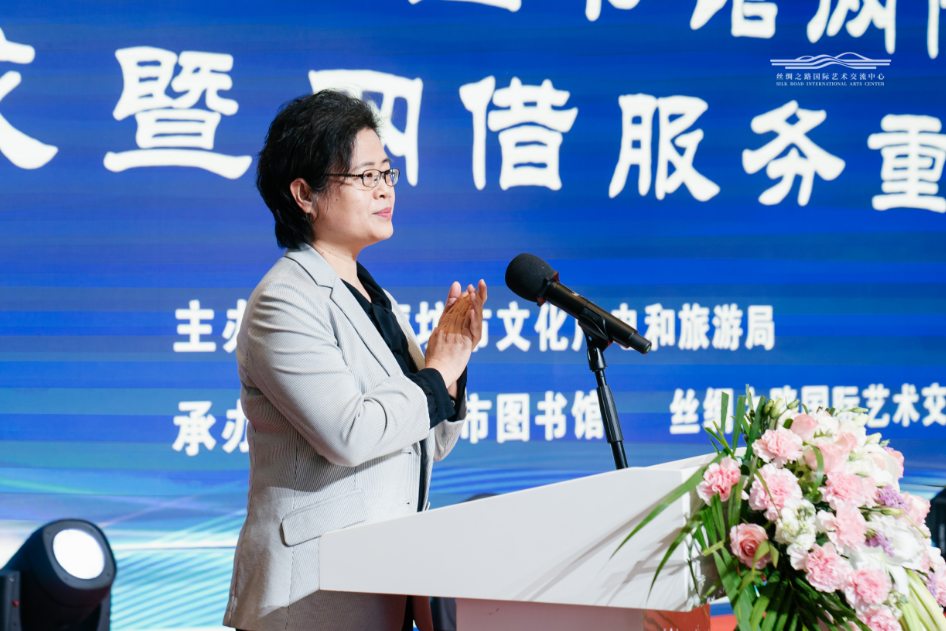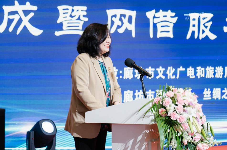 紧接着,丝绸之路国际艺术交流中心总裁克劳迪娅·杨致辞,她对仪式的举办表示衷心地祝贺。她提到,廊坊市图书馆网借书库的建成是丝路中心在内容建设上的一项重要补充,网借服务基于新技术与文化和旅游的融合,形成了新业务、新模式、新业态等智慧化应用。