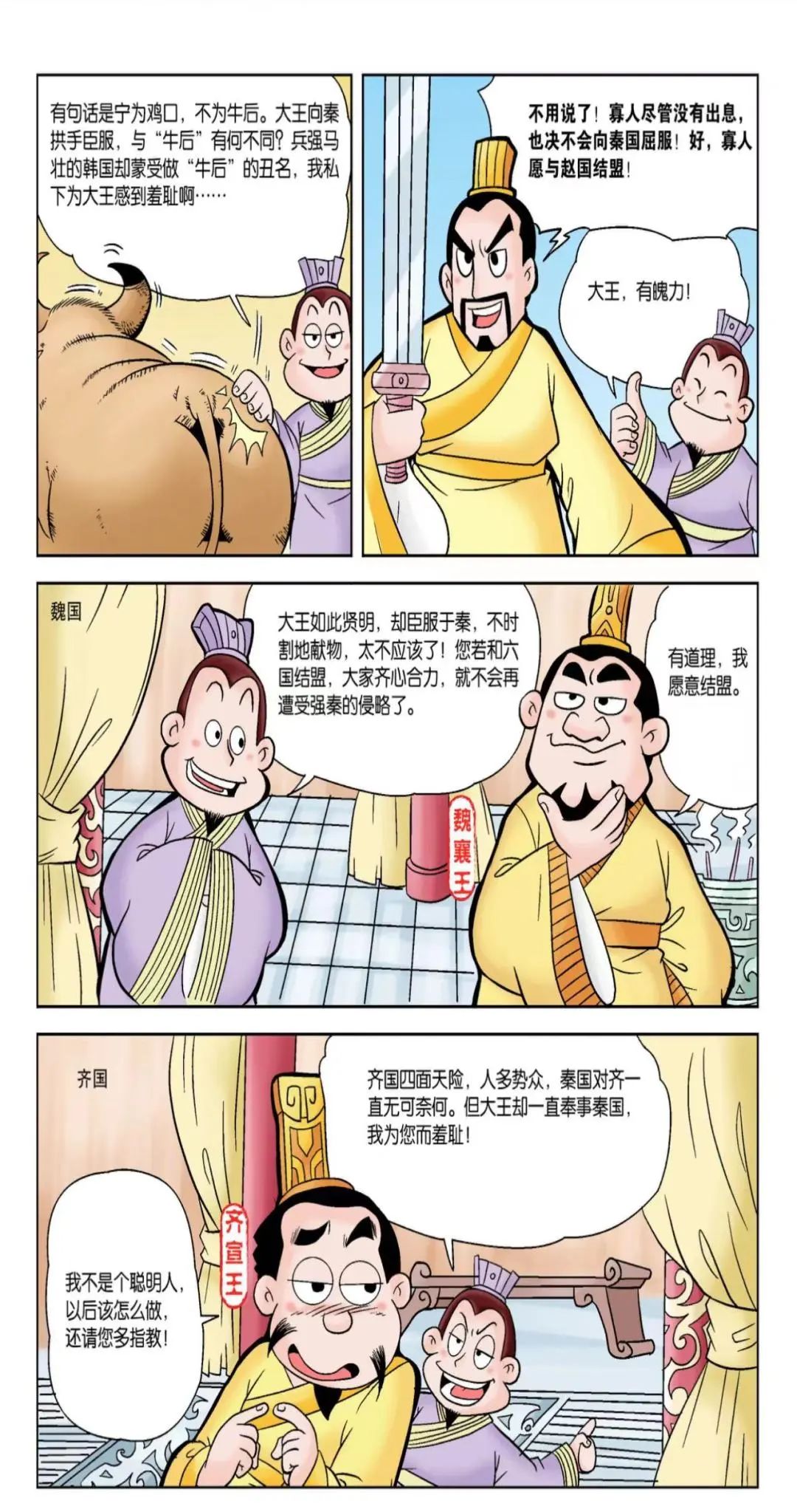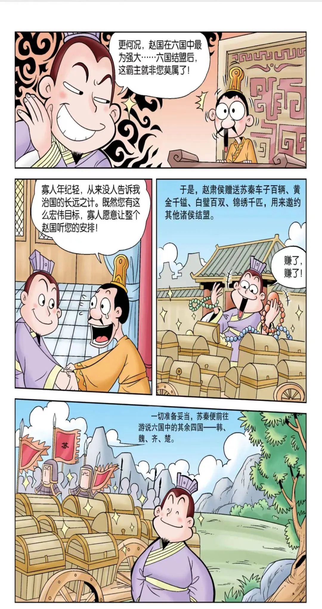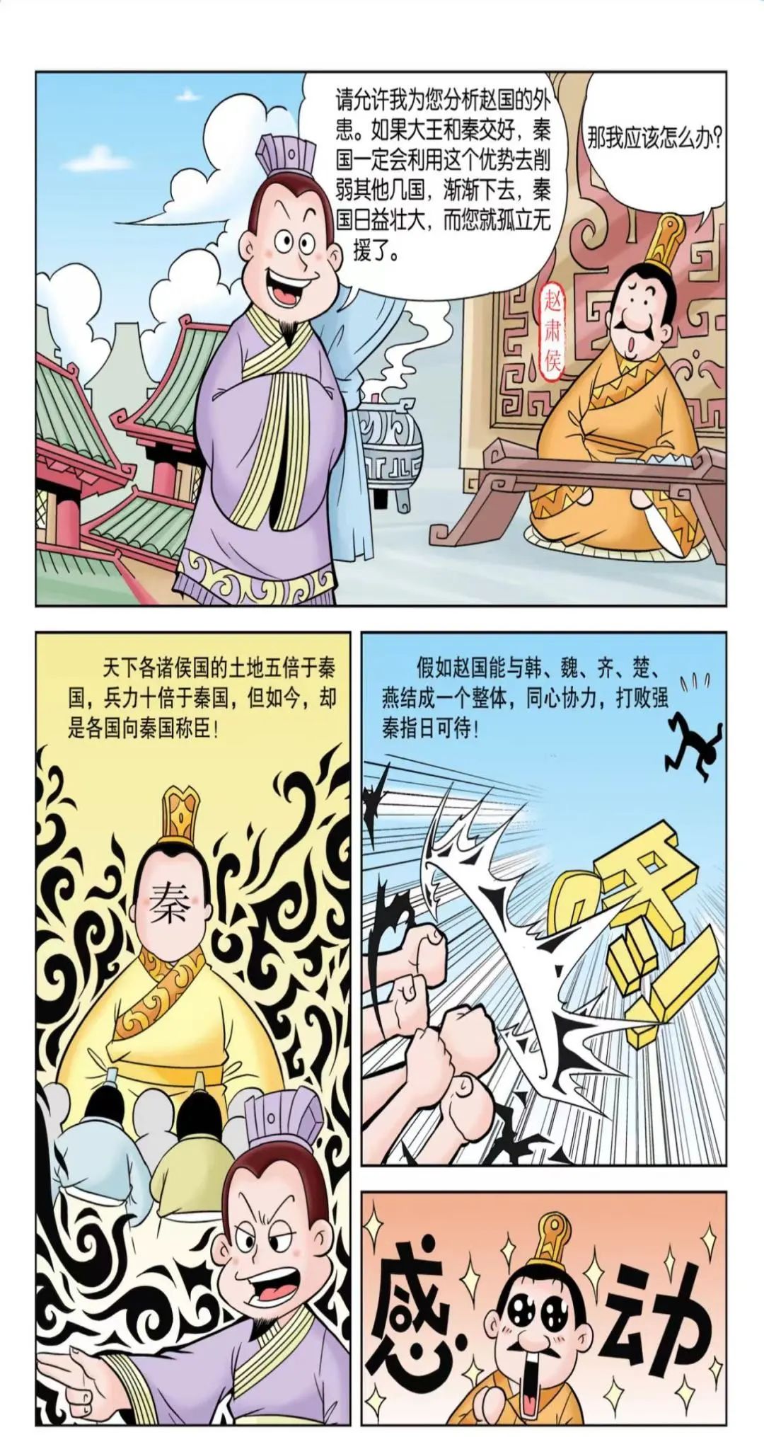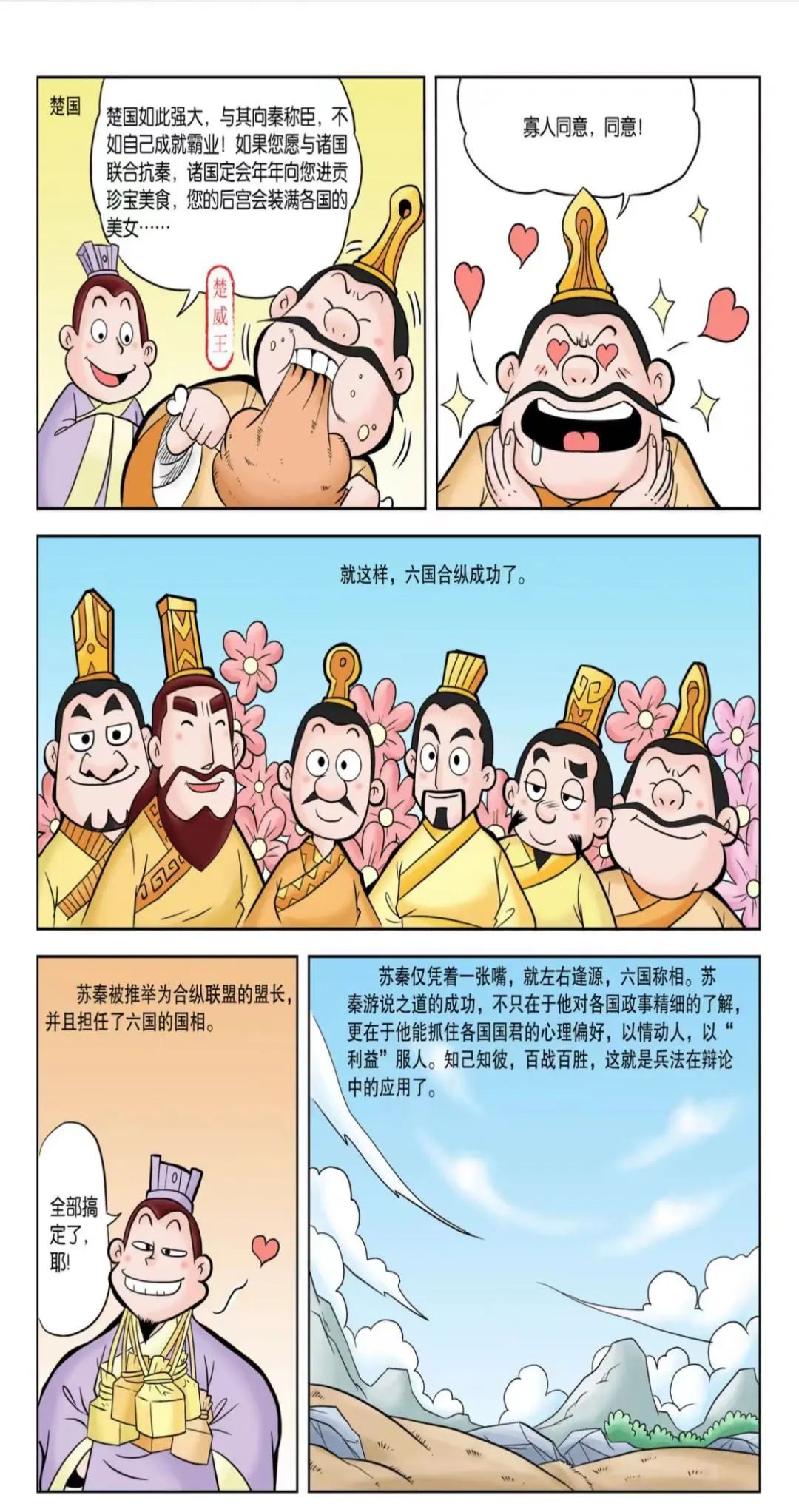 苏秦游说完各个诸侯后,六国达成合纵联盟,团结一致。苏秦被任命为从约长(合纵联盟的联盟长),并且担任了六国的国相,同时佩戴六国相印。