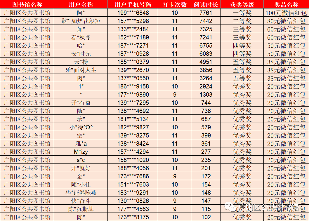 由广阳区图书馆举办的“ 四大名著·经典诵读” 共读打卡活动,在读者们的积极参与下圆满结束啦!以下将公布本次活动的获奖读者名单,请中奖读者凭中奖信息添加微信领取奖励!