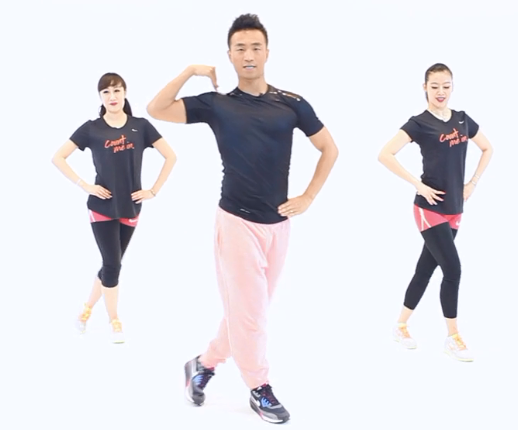 双手叉腰,以左脚为中心,右脚前后步,之后左右脚反方向操作一次。(此动作需注意肩膀朝向前方,不要左右摆动)