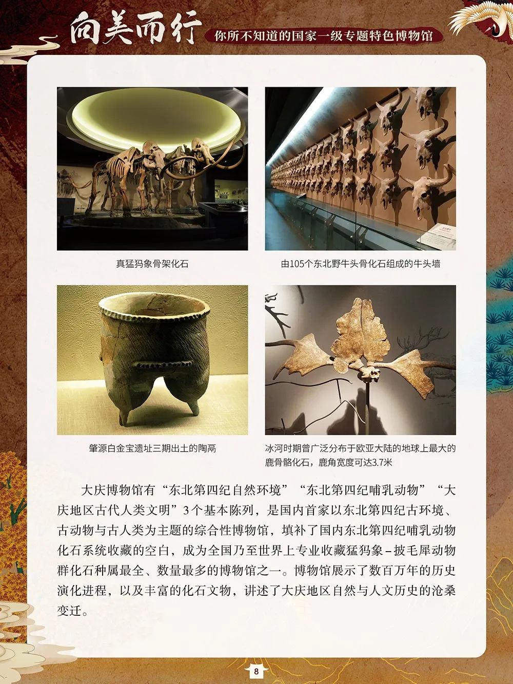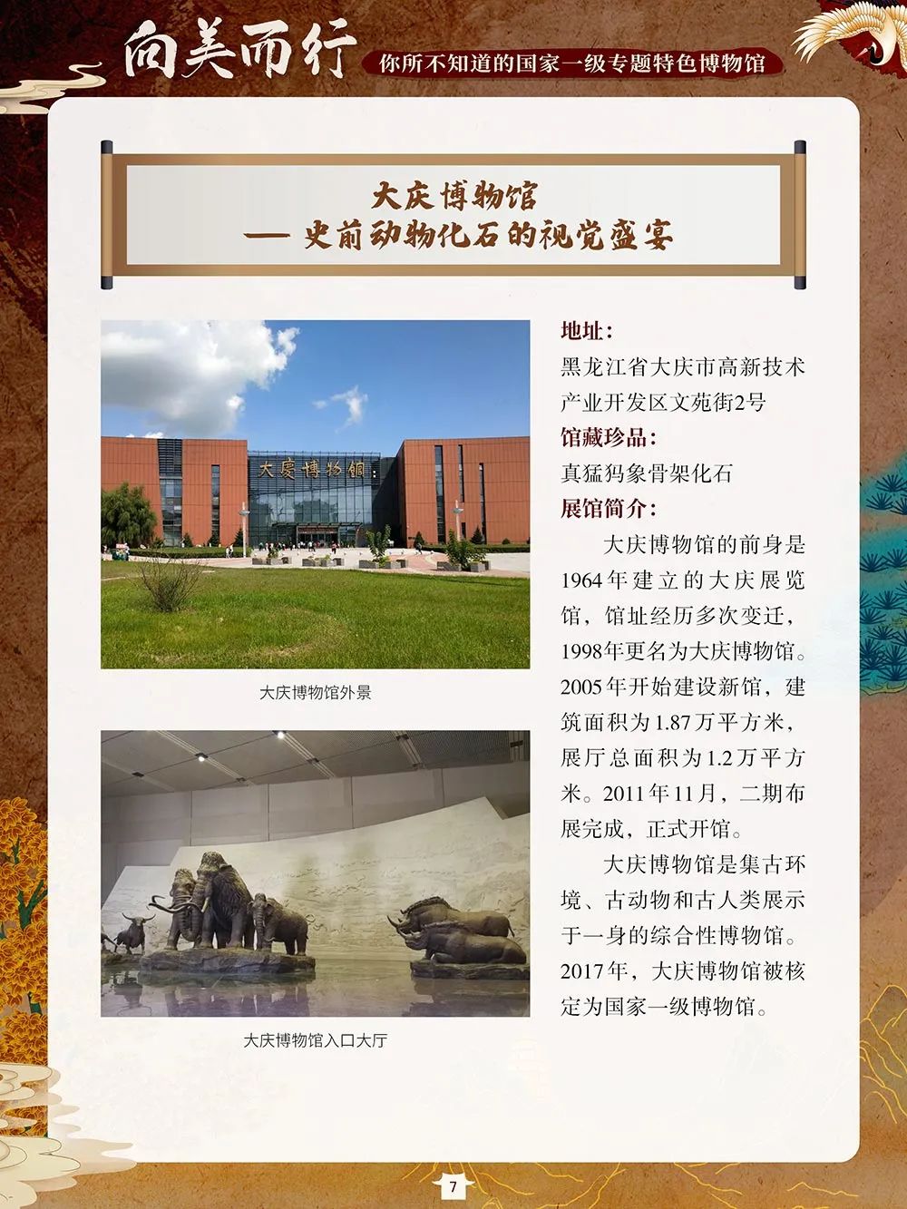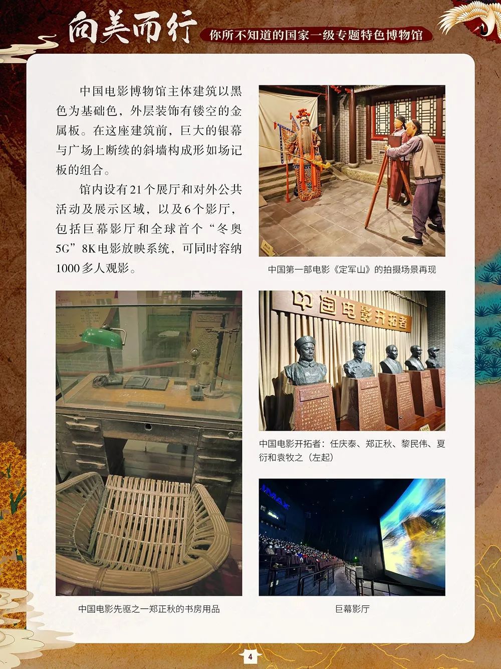 截至2021年,我国备案博物馆总数为6183 家,其中90% 以上 实现免费开放。国家一级博物馆数量达到204 家,遍及全国各地,除了中国国家博物馆、故宫博物院等大家耳熟能详的博物馆,还有很多我们可能从未耳闻的专题博物馆,如为庆祝中国电影诞生百年而建的中国电影博物馆、珍藏真猛犸象骨架化石的大庆博物馆、再现大运河繁华盛景的淮北市博物馆、领航新时代博物馆运营模式的青岛啤酒博物馆、“为汉字安家”的中国文字博物馆、在唐代长安城西市遗址上拔地而起的西安大唐西市博物馆……这些博物馆立足行业特点和地域文化特色,有的甚至填补了国家专题博物馆门类空白。