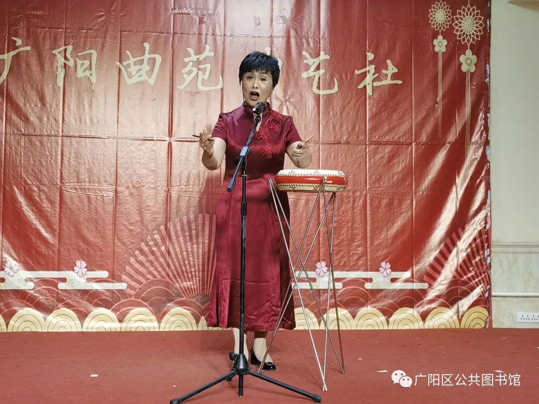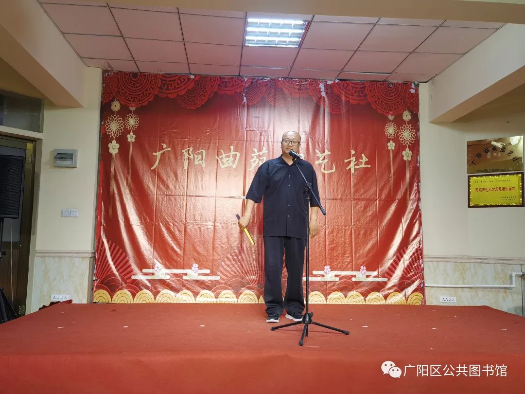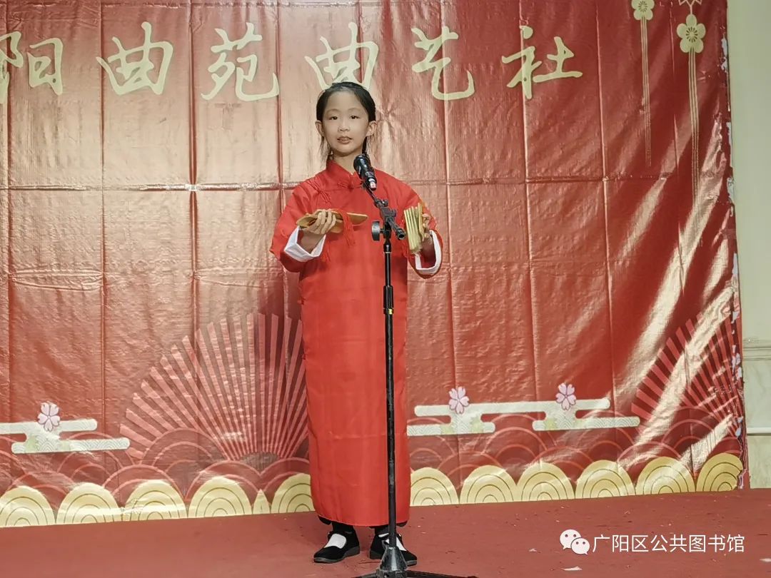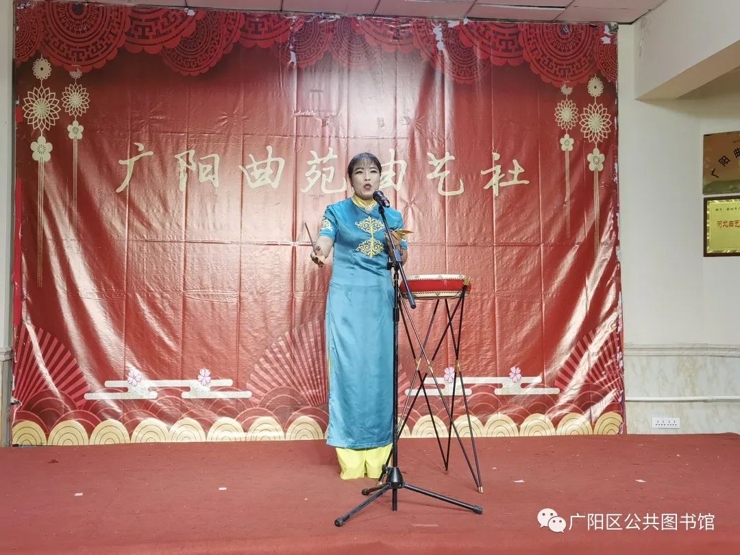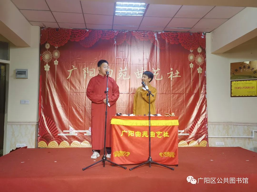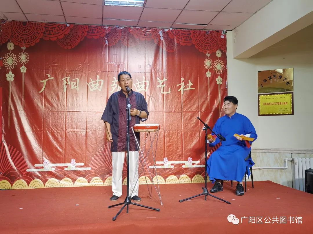 广阳曲苑曲艺社每周五展演,从晚上7点开始,节目形式多样,内容丰富多彩。凡是曲艺节目,都可以登上舞台,一展风采,至今聚集了广阳及周边地区的曲艺爱好者60余人,囊括快板、天津快板、京东大鼓、西河大鼓、相声、竹板书、太平歌词、评书等曲种。