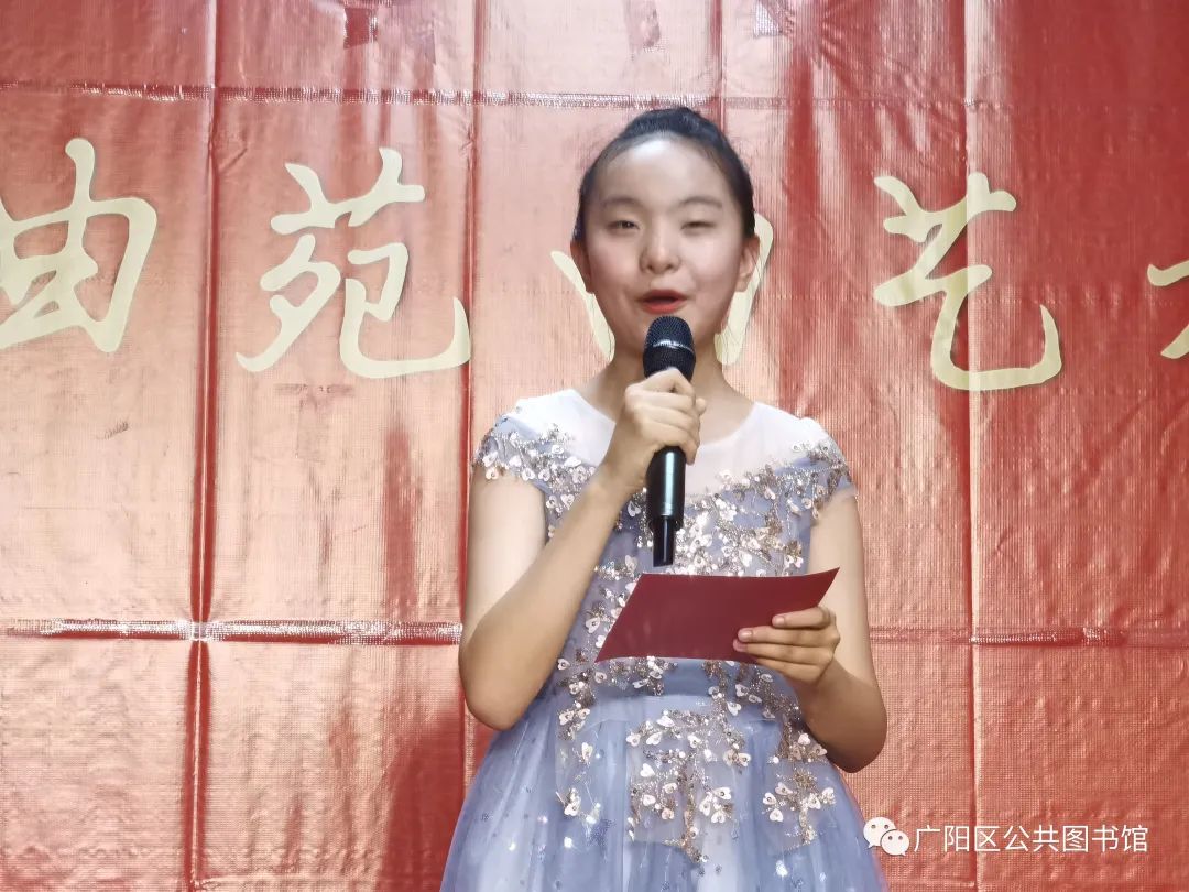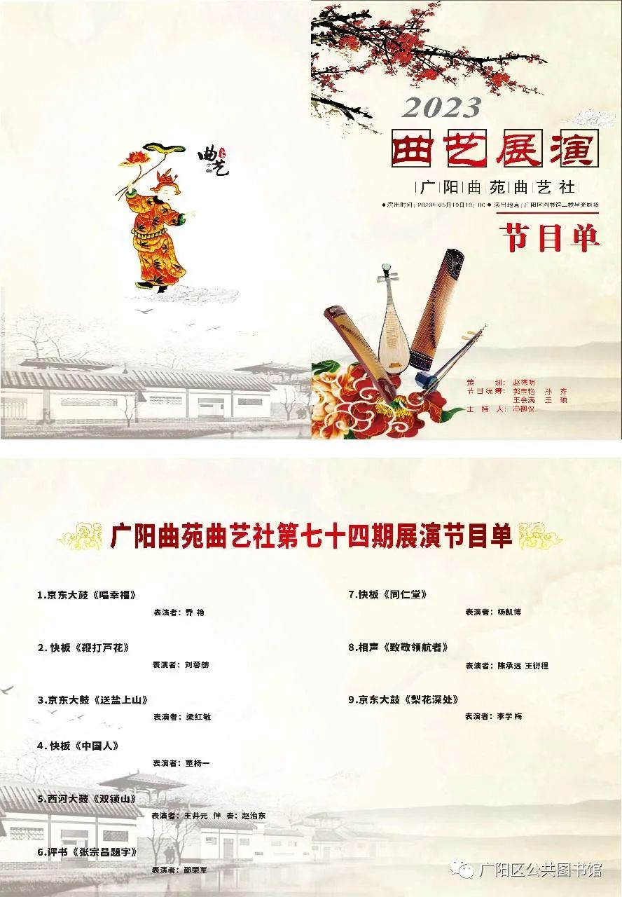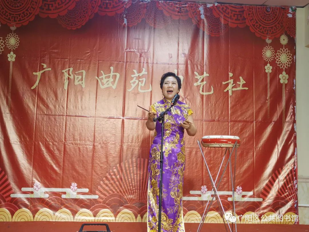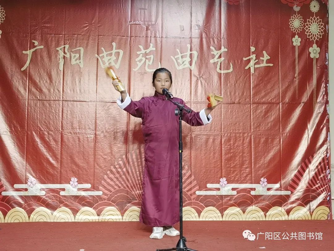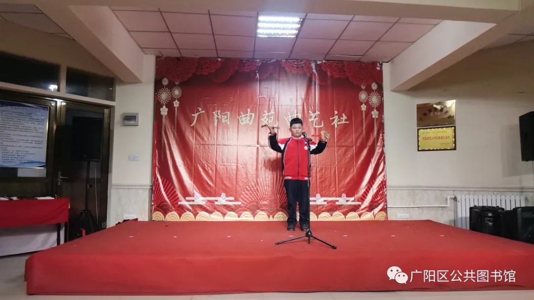 广阳曲苑曲艺社每周五展演,从晚上7点开始,节目形式多样,内容丰富多彩。凡是曲艺节目,都可以登上舞台,一展风采,至今聚集了广阳及周边地区的曲艺爱好者60余人,囊括快板、天津快板、京东大鼓、西河大鼓、相声、竹板书、太平歌词、评书等曲种。