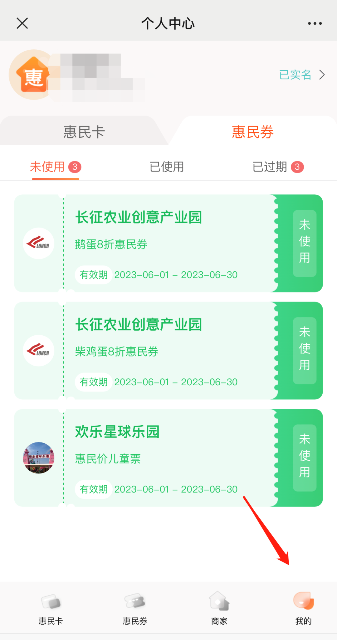 4、领取成功后,可选择“我的”查看已领惠民券的数量和使用状态。