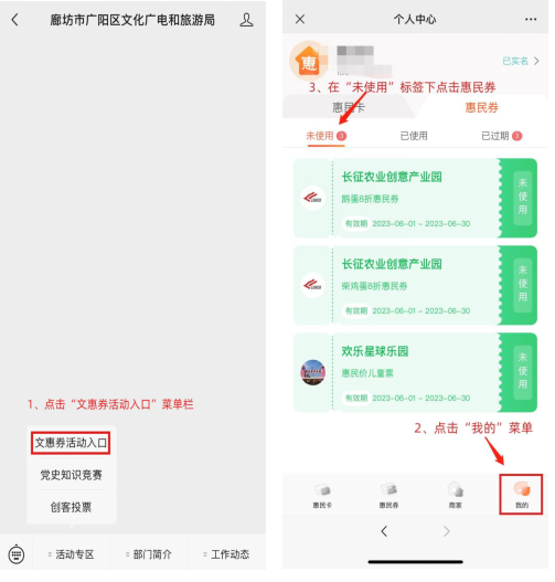 1、打开“廊坊市广阳区文化广电和旅游局”微信公众号,依次点击底部“活动专区-文惠券活动入口-我的”菜单。