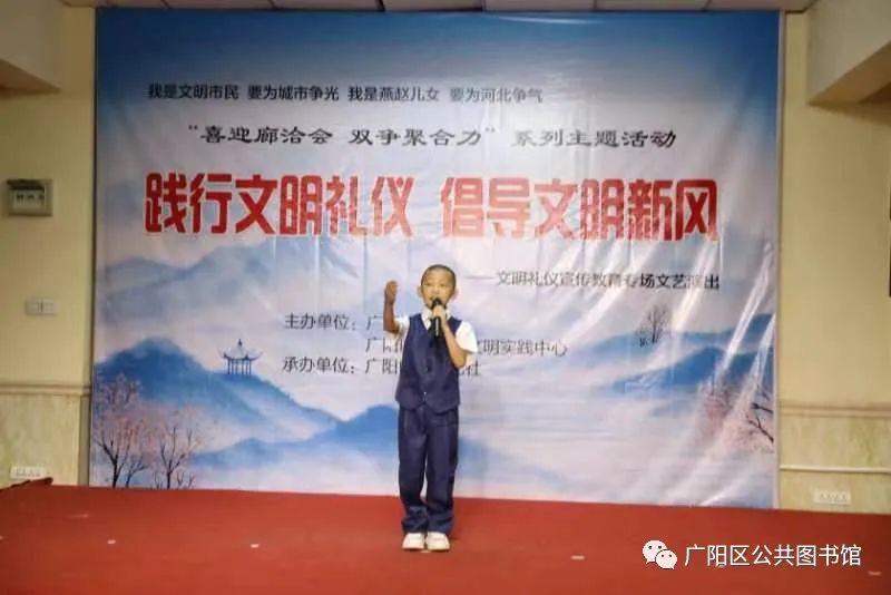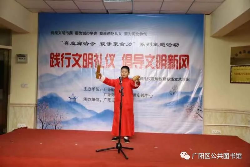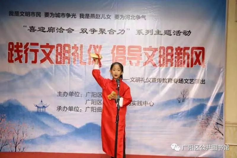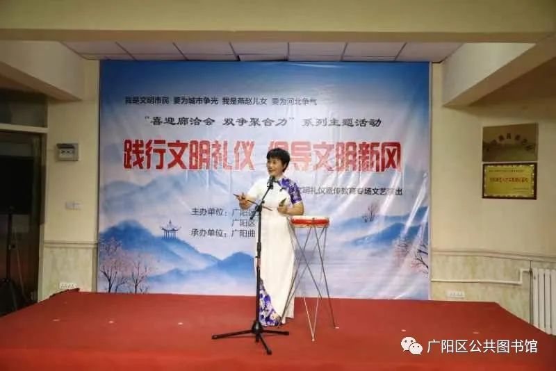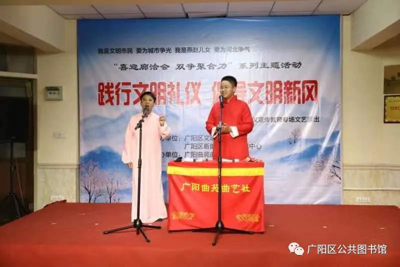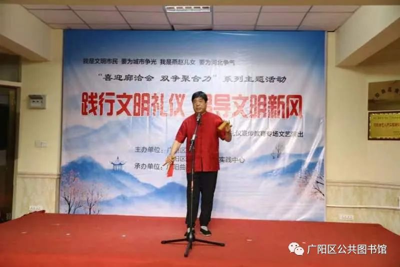 经过精心策划,认真准备,6月9日晚7点,在广阳区公共图书馆小剧场,在一片掌声中,由广阳区文明办、广阳区新时代文明实践中心主办,广阳区苑曲艺社承办的“喜迎廊洽会 双争聚合力”系列主题活动“践行文明礼仪 倡导文明新风”文明礼仪宣传教育专场文艺演出暨广阳曲苑曲艺社第七十七期展演拉开帷幕。