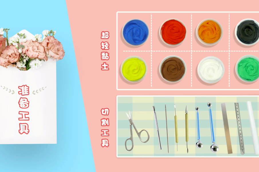 超轻黏土:需要准备蓝色、红色、橙色、墨绿、亮黄、白色、绿色的黏土。