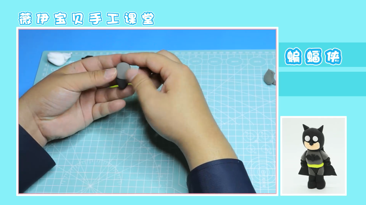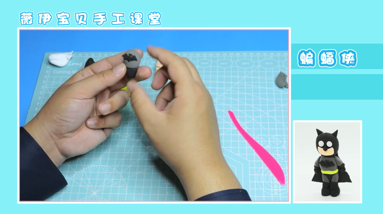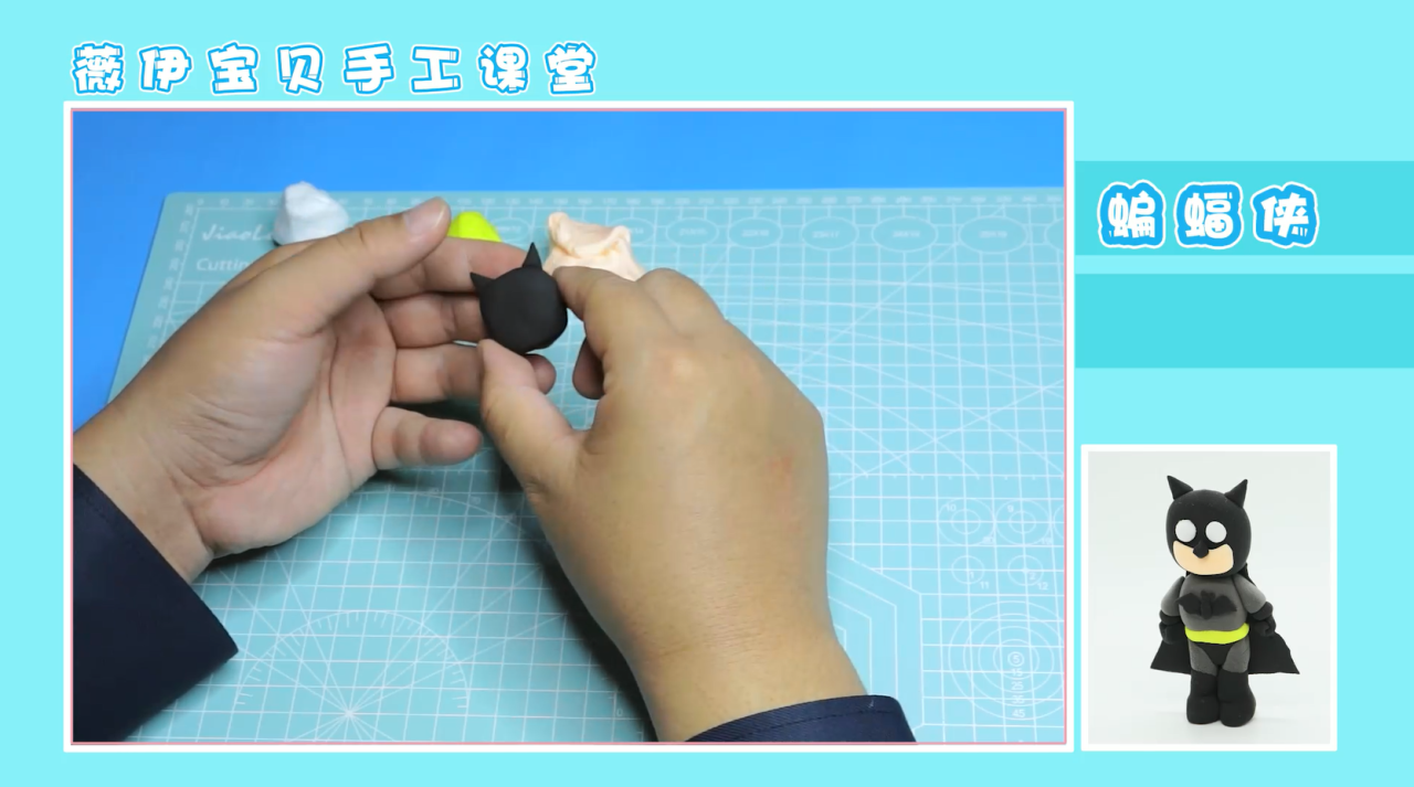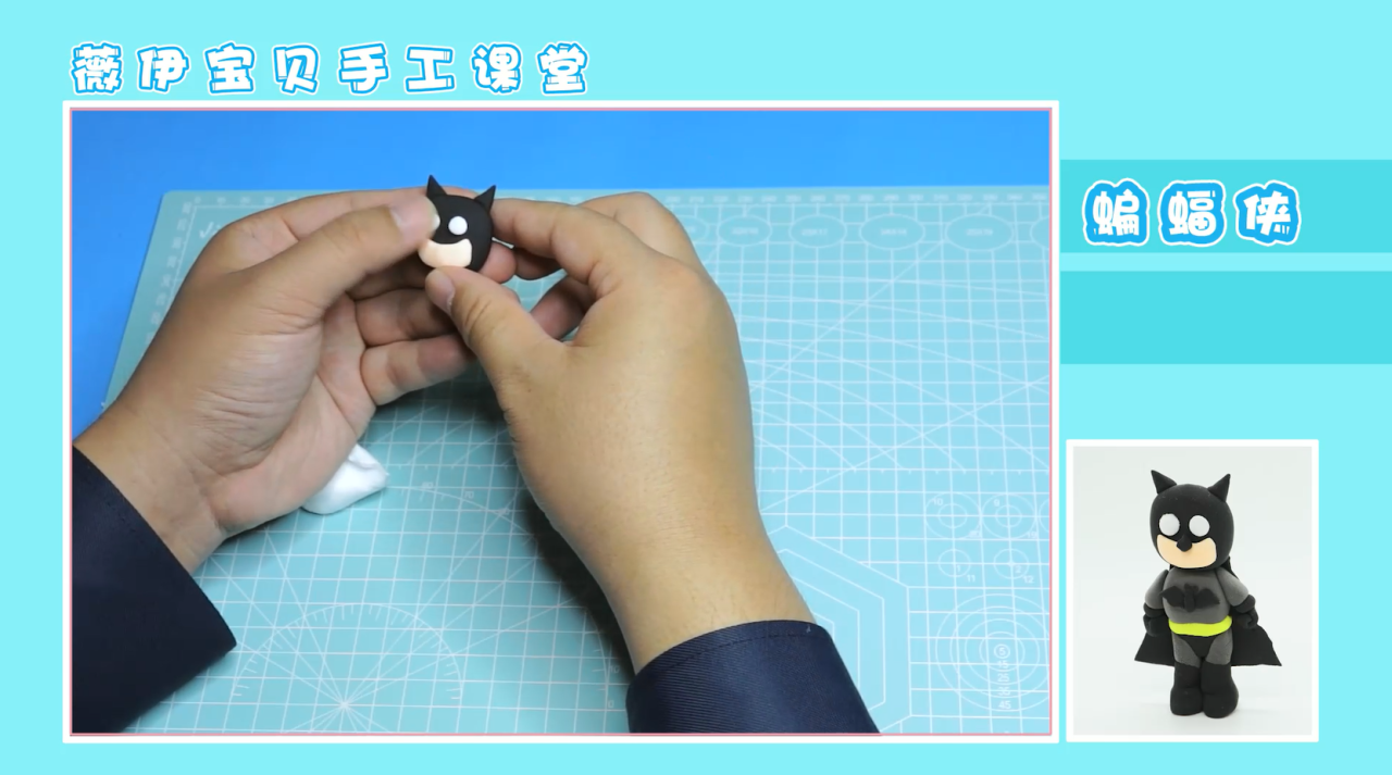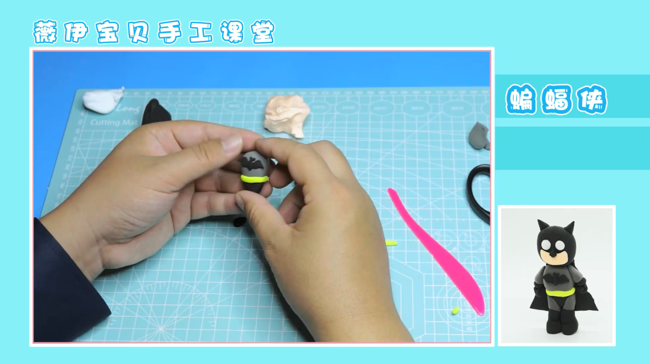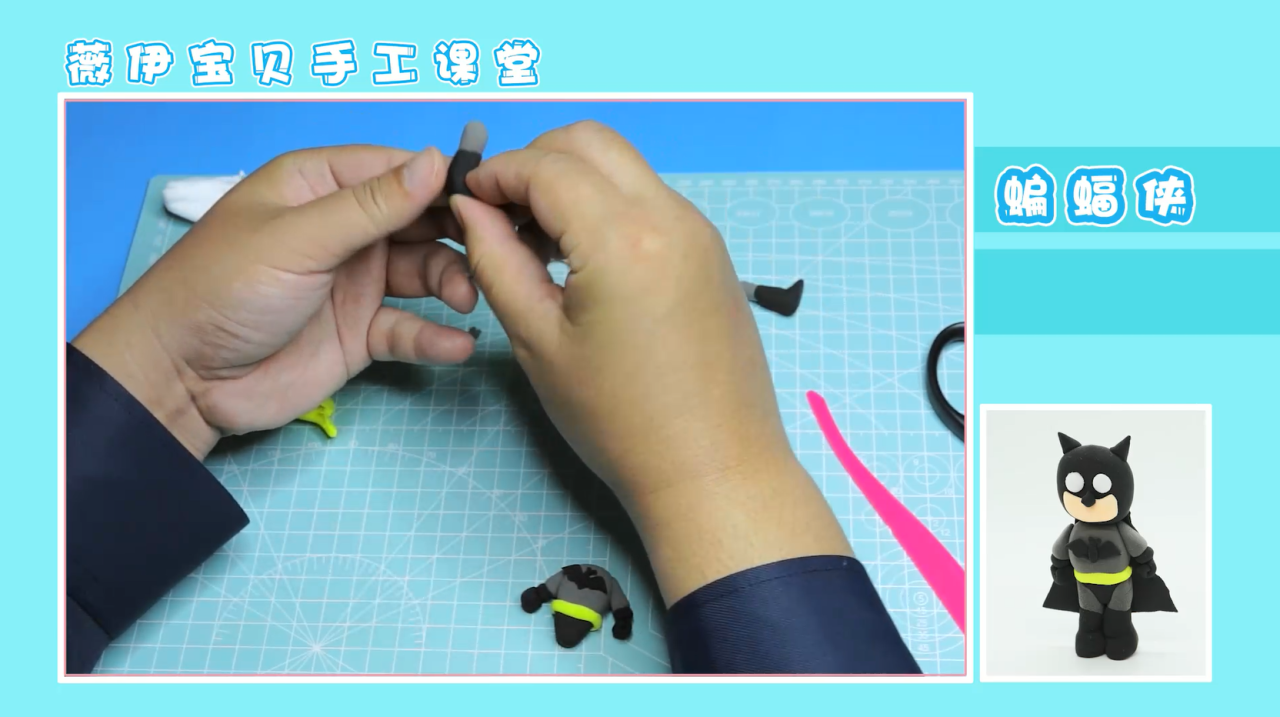 接下来,我们就可以准备开始拼接了。将各部位都拼接在对应的位置上,注意头部要用牙签与身体相连接,这样才不易滑落。接着,我们取大块黑色粘土,压成片状,用切割工具切割成一个梯形状,置于蝙蝠侠的身后。这样,蝙蝠侠的披风也就做好啦,作品就完成啦!