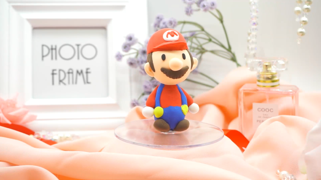 取黄色粘土,揉制两个圆饼状,置于背带与裤子的连接处,接着我们把马里奥的头部也加上。取橙色粘土揉长条状制作出2条手臂,在手臂末端用白色粘土揉制的小圆球相连,这样,我们就做出了马里奥的手。我们再取棕色粘土,制作出马里奥的鞋子,装在裤子下方。在最后,我们揉制2个蓝色的长条,翻到马里奥的背面,我们将长条交叉置于马里奥的背后,这就做好了马里奥的背带。我们的作品就做好啦!大家学会了吗?