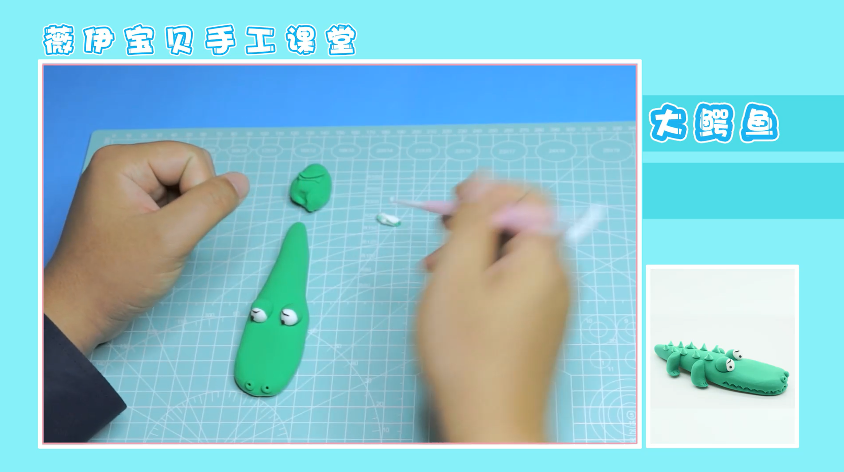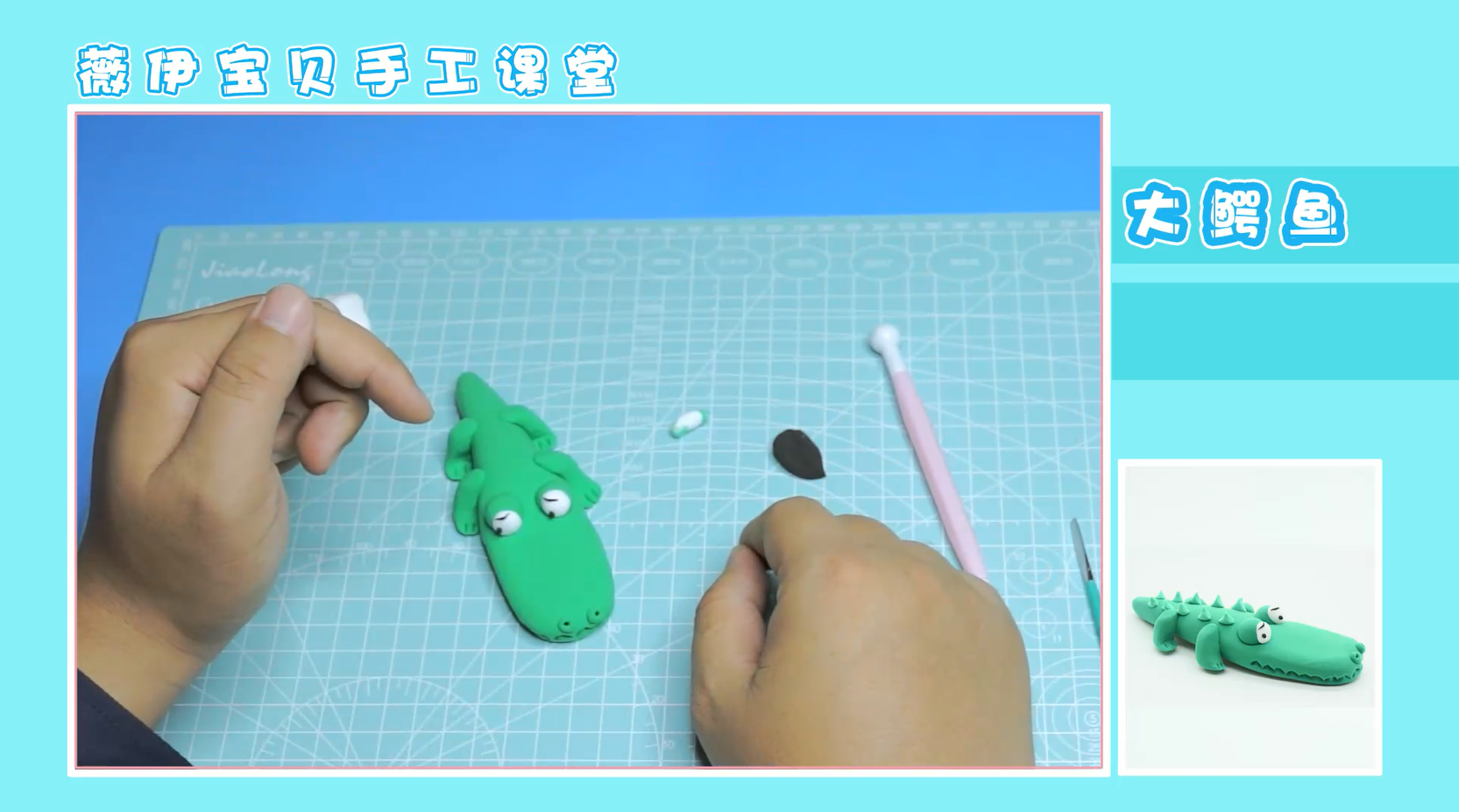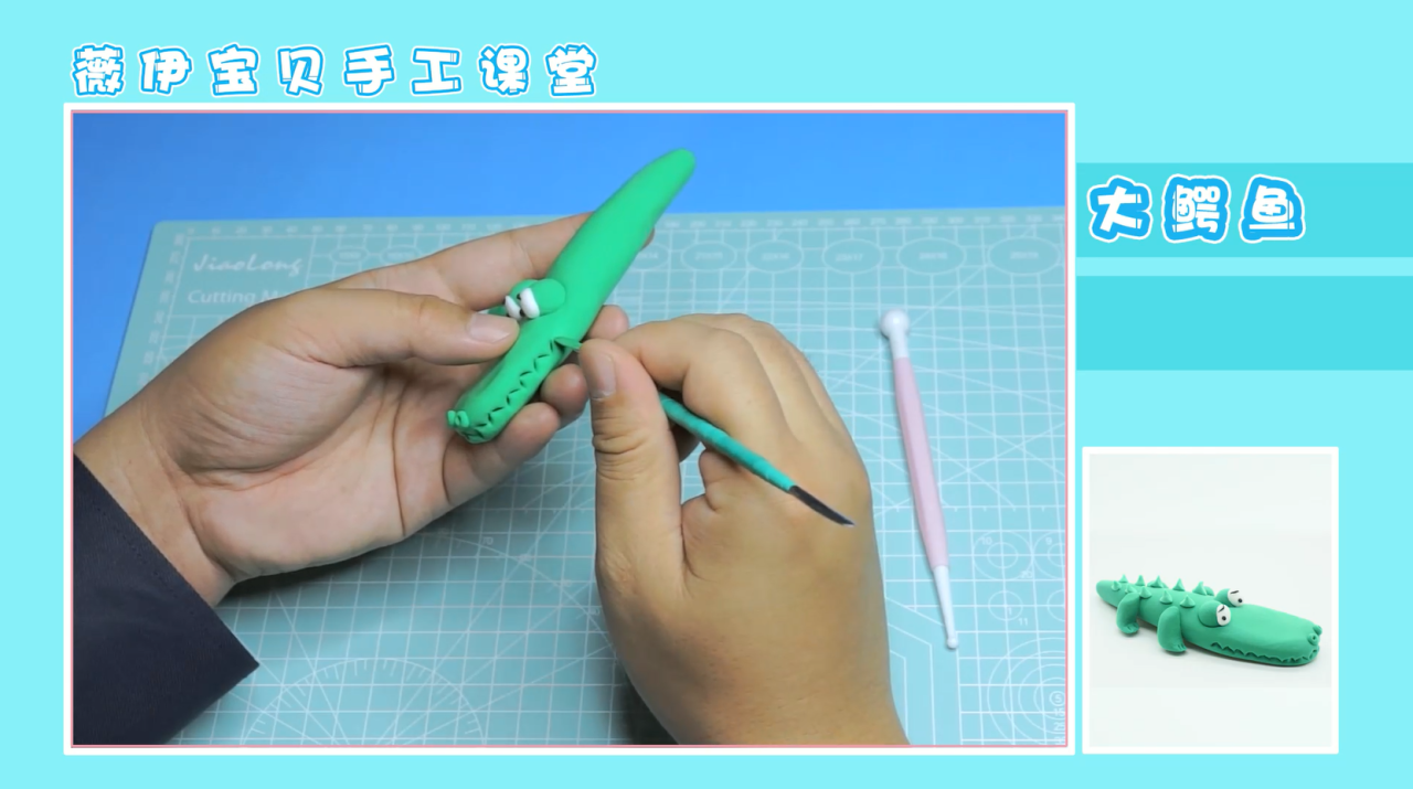 将绿色与白色粘土进行混合,得到淡绿色粘土,利用淡绿色粘土,揉制类似于钉子形状的物体,倒着放置在鳄鱼眼睛后方两侧,如图所示位置。这样,我们的作品就完成啦!大家学会了吗?