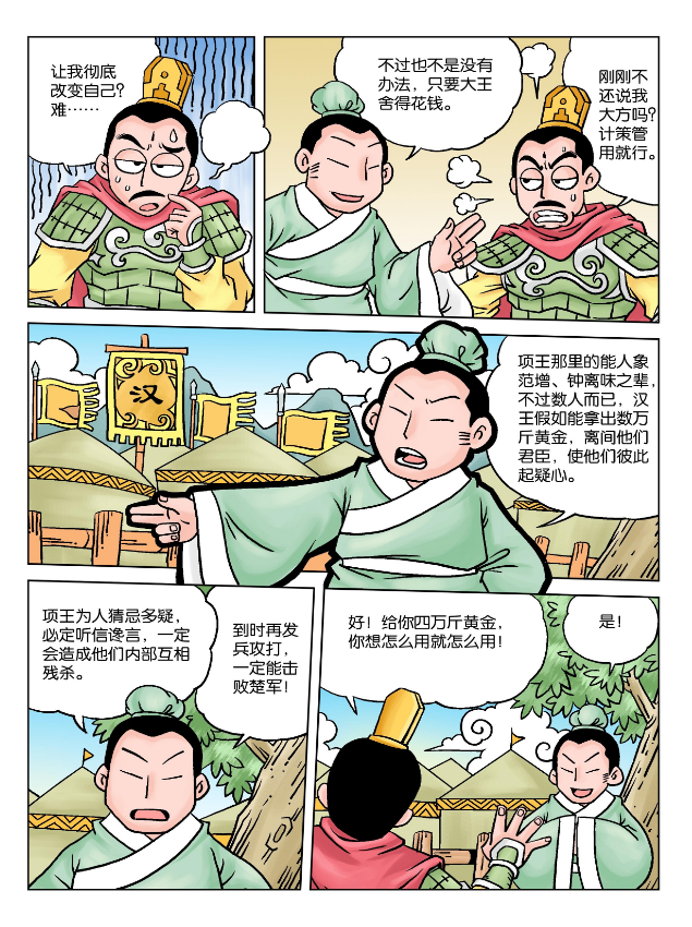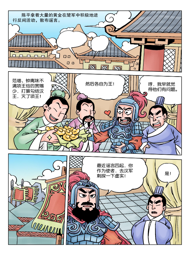 刘邦向项羽求和,项羽不许,刘邦十分忧虑。这时,陈平献计,让刘邦从仓库中拨出四万斤黄金,买通楚军的一些将领,让这些人散布谣言说:“在项王的部下里,范亚父和钟离昧的功劳最大,但却不能裂土称王。他们已经和汉王约定好了。共同消灭项羽,分占项羽的国土。”这些话传到霸王的耳朵里,使他起了疑心,果然对钟离昧产生了怀疑,以后有重大的事情也就不再跟钟离昧商量了。他甚至怀疑范增私通汉王,对他很不客气。