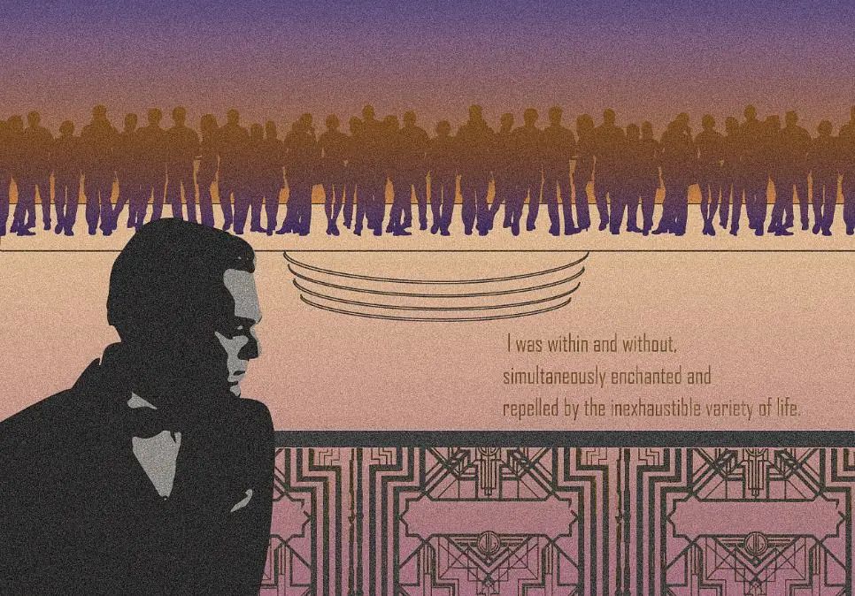 当我坐在那里缅怀那个古老的、未知的世界时,我也想到了盖茨比第一次认出了黛西的码头尽头的那盏绿灯时所感到的惊奇。他经历了漫长的道路才来到这片蓝色的草坪上,他的梦一定就像是近在眼前,他几乎不可能抓不住的。他不知道那个梦已经丢在他背后了,丢在这个城市那边那一片无垠的混饨之中不知什么地方了,那里合众国的黑黝黝的田野在夜色中向前伸展。盖茨比信奉这盏绿灯,这个一年年在我们眼前渐渐远去的极乐的未来。