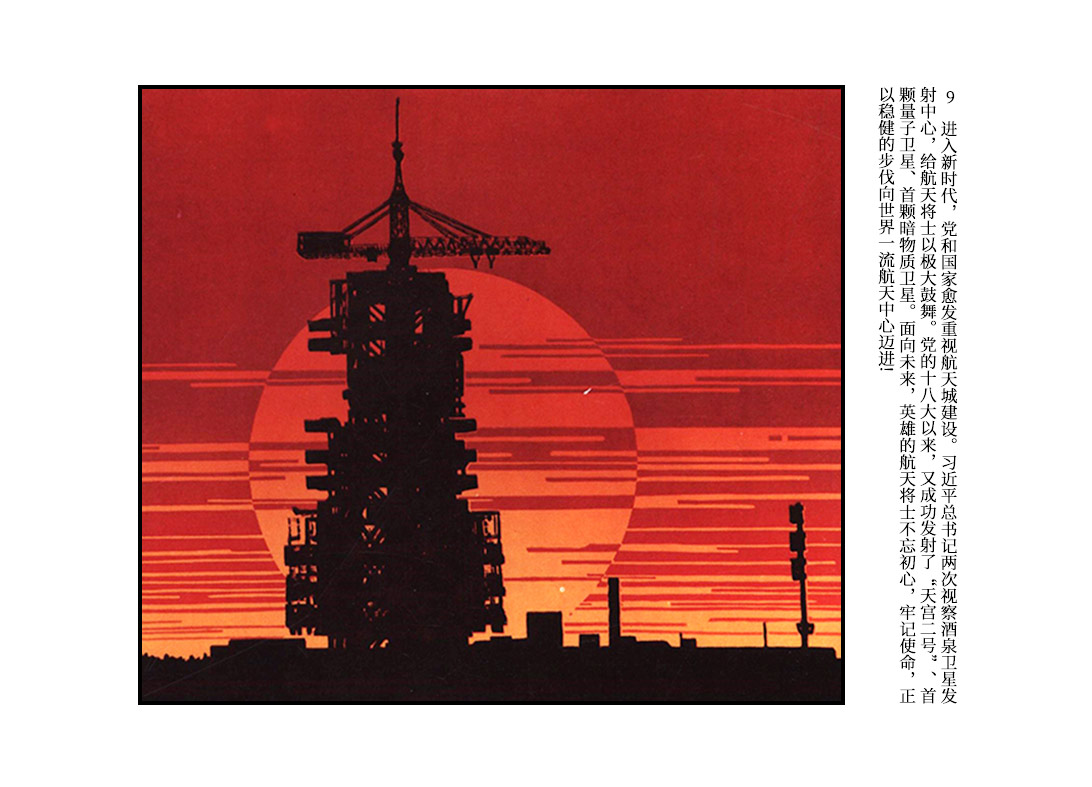 《共和国的航天城》是为反映50年来我国航天事业取得的伟大成就、弘扬伟大的载人航天精神而精心创作的一本连环画。它采用套色木刻形式,展现了“东方红一号”人造地球卫星、“神舟五号”载人飞船发射等中国航天史上的壮美场面,歌颂了中国共产党人“特别能吃苦、特别能战斗、特别能攻关、特别能奉献”的载人航天精神。