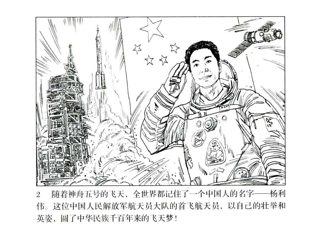 连环画《飞向太空梦——杨利伟》讲述了“中华飞天第一人”——航天英雄杨利伟从飞行员到航天员,从普通军人到航天勇士的人生道路,重点描绘杨利伟乘坐“神舟五号”载人飞船探索太空这一非凡壮举,讴歌了中国共产党人“特别能吃苦、特别能战斗、特别能攻关、特别能奉献”的载人航天精神。