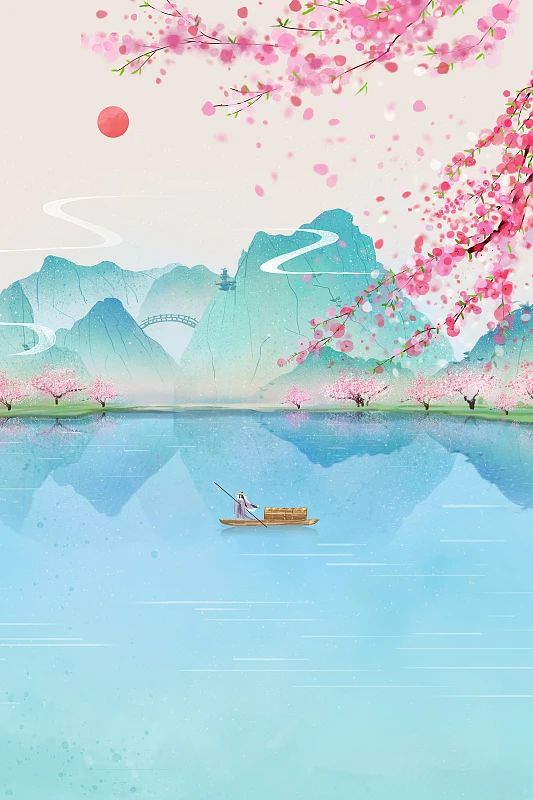 【注】江上千里浪花翻滚如雪,岸上一排排的桃花虽无言,却竞相怒放,春意浓浓。身边一壶美酒,手中一支钓竿,世上这样自由快乐的人有几个?