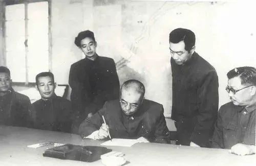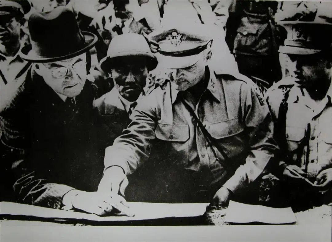 图为:美国总统特使杜勒斯(左一)、南朝鲜军的美军顾问团团长罗伯特(左三)、南朝鲜国防部长官申性模(左二)、南朝鲜陆军总参谋长丁一权等,在三八线南侧视察阵地。