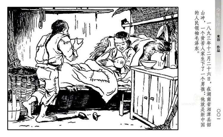 连环画《少年毛泽东》主要讲述了1893年至1905年毛泽东早年的生活经历,根据美国记者埃德加·斯诺《西行漫记》第四章《一个共产党员的来历》创作而成。米谷将漫画的手法运用到连环画创作中,准确并适度夸张地描绘出一幅幅鲜活、生动的图画,表现了少年毛泽东爱憎分明、反抗压迫的精神,强烈的求学渴望,将他那宽厚和善的母亲、严厉的父亲、儿时天真的伙伴、粗暴的学堂先生、凶悍的地主等人物都描绘得栩栩如生。