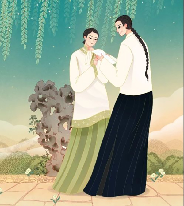 一天,芸在书簏上翻到一册《琵琶行》,因为能背诵,便一个字一个字对照认着,这才开始识了字。她做刺绣的闲暇时光,渐渐也通晓了吟咏诗词,写过“秋侵人影瘦,霜染菊花肥”这般句子。我十三岁时,随母亲回家探亲,见了她所作的诗,虽然感叹她才思隽秀,私下里却怕她福泽不深。然而心意投注,不能释怀,便告诉母亲道:“若为儿择妻子,则非淑姐不娶。”