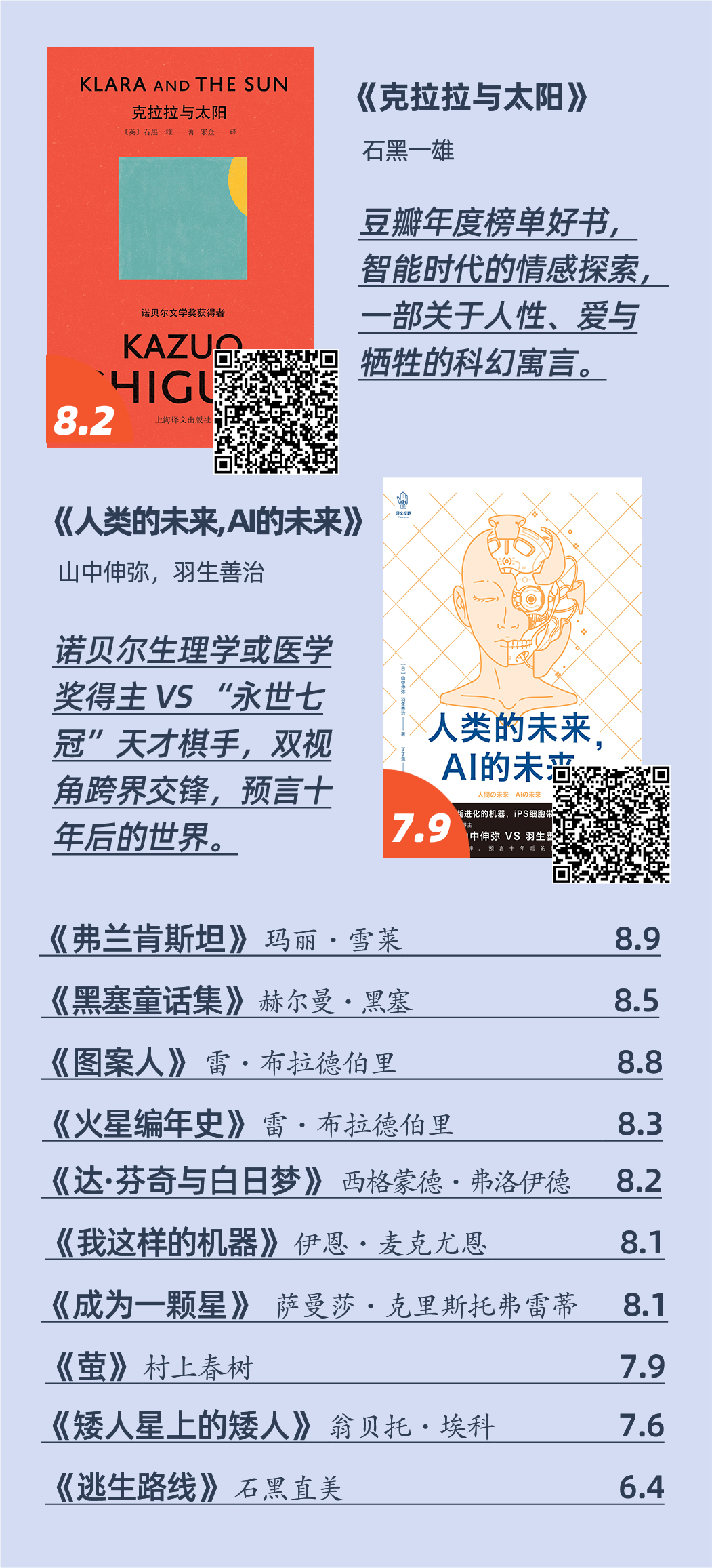 高分科幻《克拉拉与太阳》带你畅游未来世界;口碑社科《人类的未来,AI的未来》与你探讨前沿科技;大师经典《达·芬奇与白日梦》赋你一场不被束缚的白日梦......生活需要脚踏实地,但思想允许偶尔纷飞。