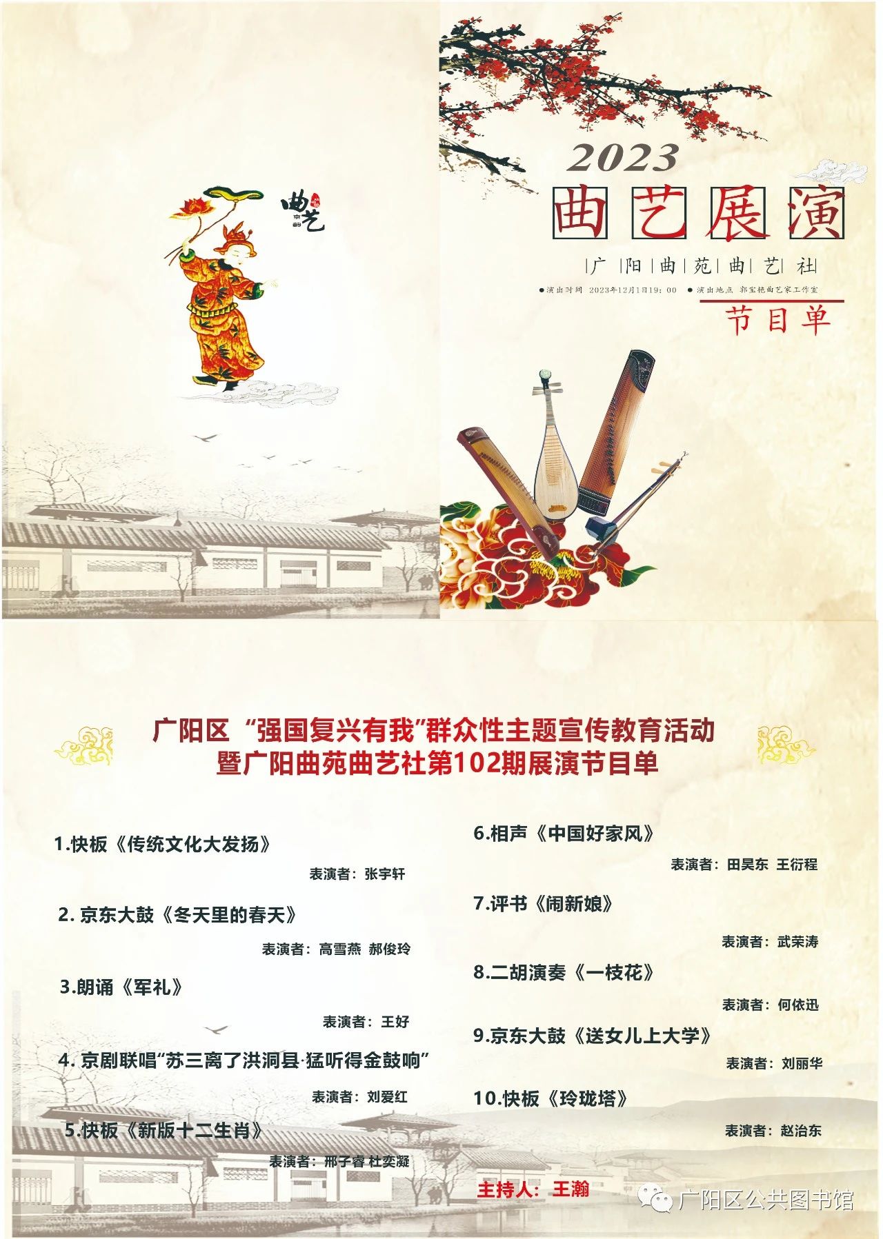 12月1日晚7点,“广阳区‘强国复兴有我’群众性主题宣传教育活动暨广阳曲苑曲艺社第102期展演”拉开帷幕.。活动由廊坊市广阳区委宣传部主办,郭宝艳曲艺家工作室、广阳曲苑曲艺社承办。