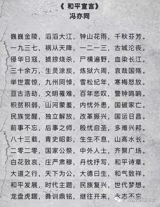 《和平宣言》用诗经体展现东方智慧,祈福世界和平。悲壮的历史追溯,庄严的和平祈愿,都浓缩在240字的宣言中,既朗朗上口、富有韵律,又饱含深情、极具震撼。