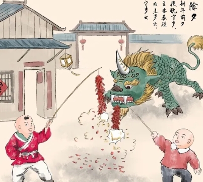相传古时候有一种叫“年”的怪兽,每到除夕爬上岸,吞性畜伤害人命。一次“年”兽闯进村。见老人身披红袍。“年”大惊失色,狼狈逃走了。从此以后,每年除夕之夜,家家户户都贴红对联、放爆竹,用来驱赶“年”兽。这个风俗越传越广,从此就有了“过年”。