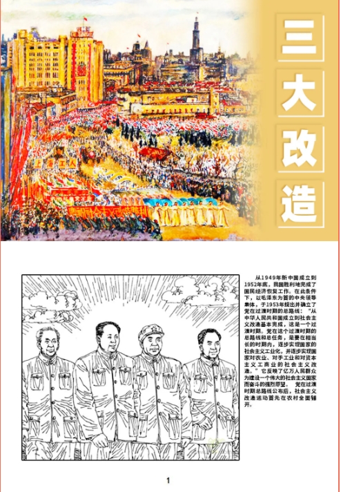 从1949年到1952年底,我国胜利完成了国民经济的恢复工作。在此条件下,以毛泽东为核心的党中央领导集体,于1953年提出并确立了党在过渡时期的总路线:“从中华人民共和国成立,到社会主义改造基本完成,这是一个过渡时期。党在这个过渡时期的总路线和总任务,是要在相当长的时期内,逐步实现国家的社会主义工业化,并逐步实现国家对农业、手工业和对资本主义工商业的社会主义改造。”党在过渡时期总路线公布后,社会主义改造运动首先在农村全面铺开。连环画《三大改造》便讲述了“三大改造”政策的制定和执行情况。
