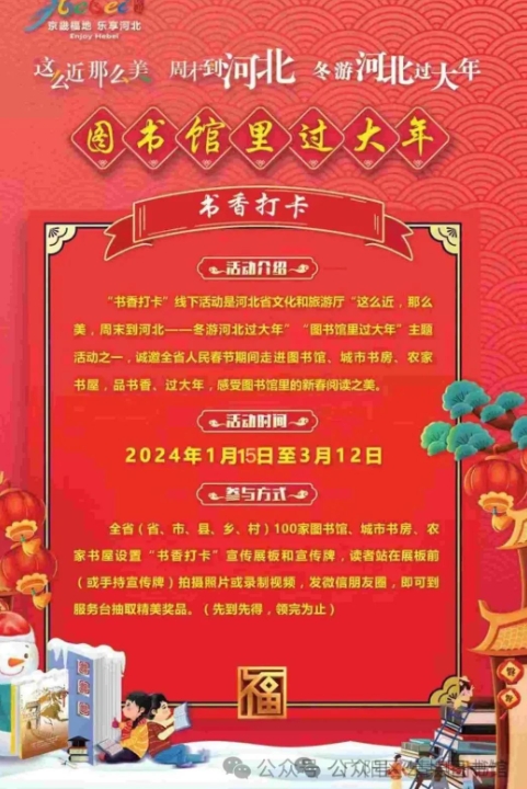 届时广阳区公共图书馆将“这么近,那么美,周末到河北——冬洲河北过大年”“图书馆里过大年”书香打卡等宣传展牌作为打卡标识,读者在打卡标识前拍照或录视频,转发朋友圈或个人媒体账号,即可到打卡点服务台领取精美奖品一份。