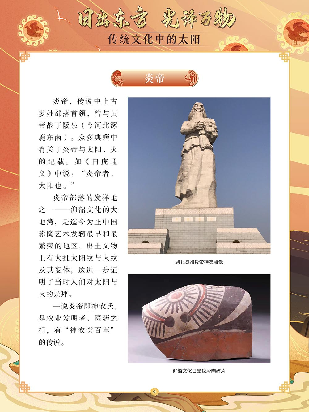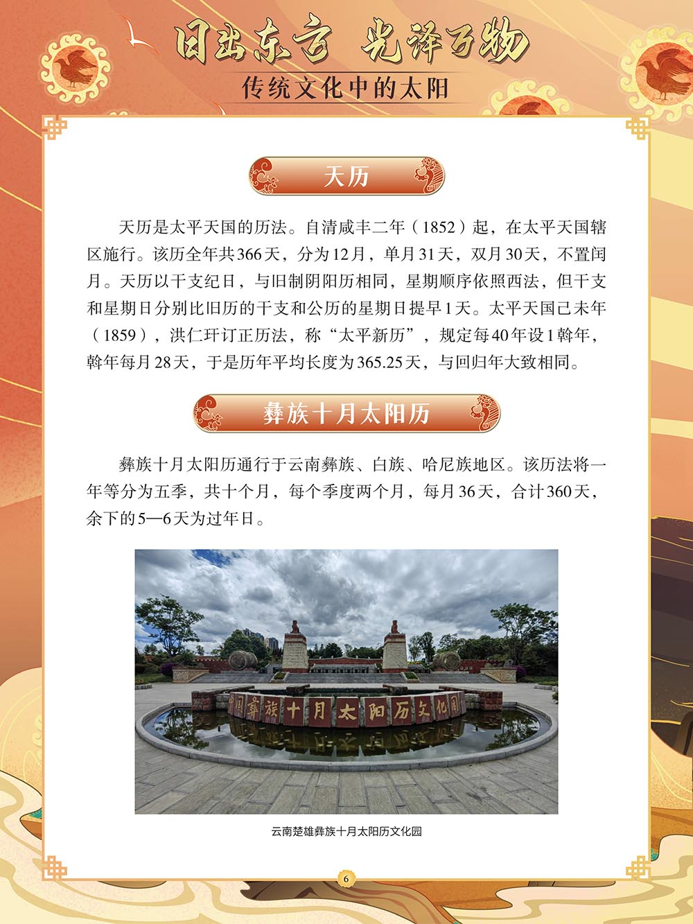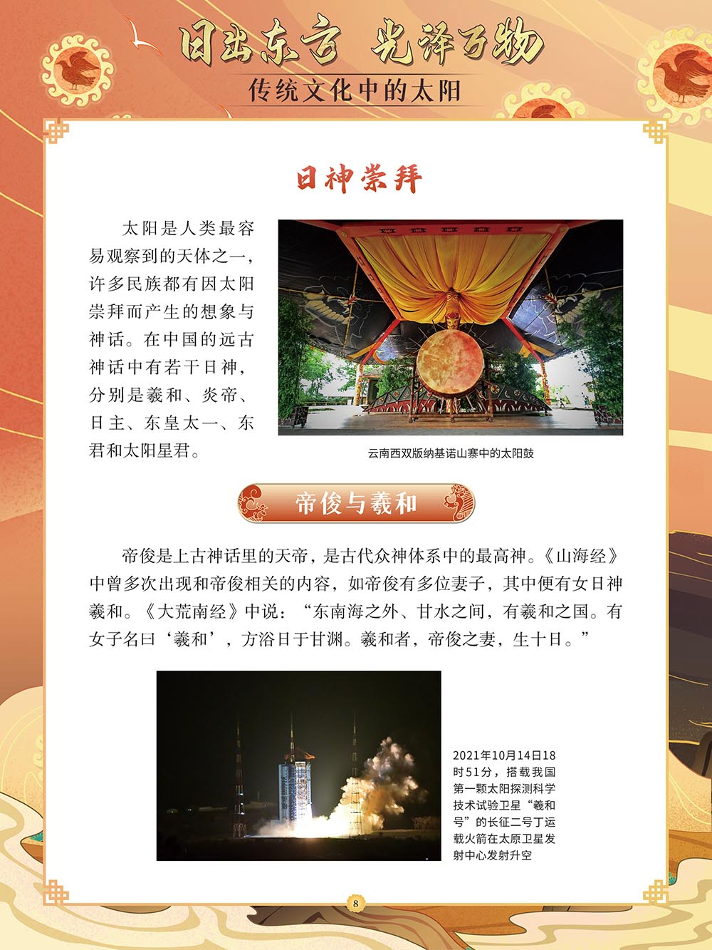 在我国的古籍文献中,如甲骨文和《山海经》《楚辞》《国语》《淮南子》《诗经》《易经》等,都有关于日神信仰和太阳神话的记载;到了汉代,太阳被称为“太阳星”;宋代《三字经》里有“三光者,日月星”之句;明末《幼学琼林》里将“日月五星”称为“七政”。历朝历代的日神信仰及其影响从远古一直延续到今天,现在的山东日照太阳文化节几乎就是古代日神崇拜的“活化石”,一些少数民族也依然保留着拜日祭天的仪规。值此新年元旦到来之际,我们特别策划了本展览,带领大家领略传承千百年的太阳文化,体会中华传统文化的博大精深。