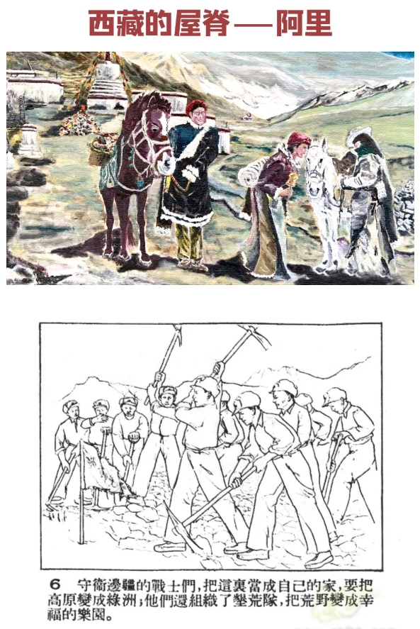 阿里地区位于西藏西部,青藏高原西南部,平均海拔在4500米以上,被称作“世界屋脊的屋脊”“高原上的高原”。连环画《西藏的屋脊——阿里》讲述了阿里地区解放后,军民携手克服险恶的自然环境,积极建设阿里的感人事迹。