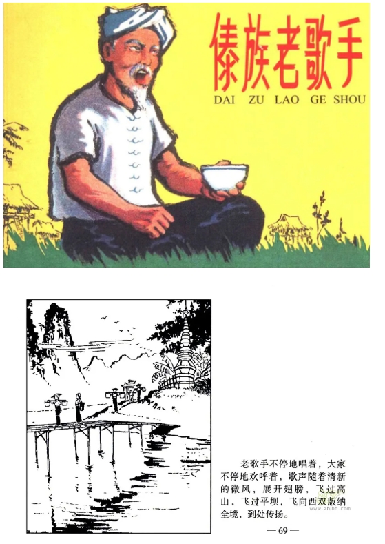 在连环画《傣族老歌手》中,一位傣族著名老歌手对工作组产生了误解,后来受到新事物的感染和党的教育终于改变观念,重新愉快地唱起歌来。