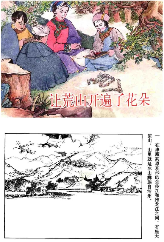 连环画《让荒山开遍了花朵》讲述了新中国成立初期,在党和政府的关怀下,一位杰出彝族女青年舍身忘我地投入家乡教育事业的先进事迹。