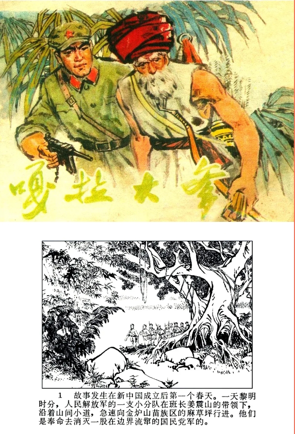 连环画《嘎拉大爹》讲述了新中国成立后的第一个春天,一支解放军部队在苗族老人嘎拉大爹的多次援助下,成功清剿流窜于边境的国民党军残余势力,并彼此结下深厚情谊的故事。