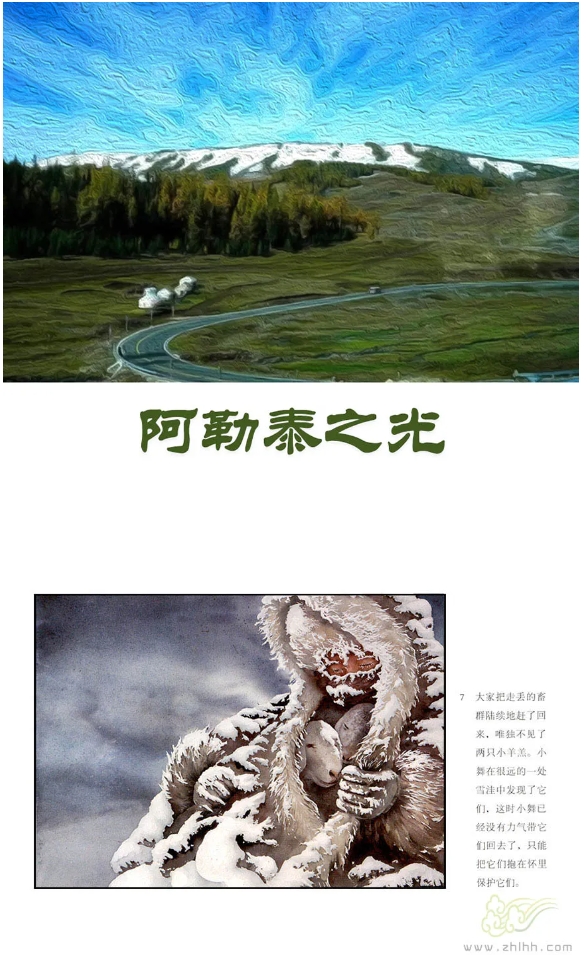 连环画《阿勒泰之光》讲述了冬季牧场迁徙期间,发生在一个汉族女孩和一个哈萨克族人之间的故事。他们开始互相排斥,甚至矛盾激化、爆发,最后彼此和解。