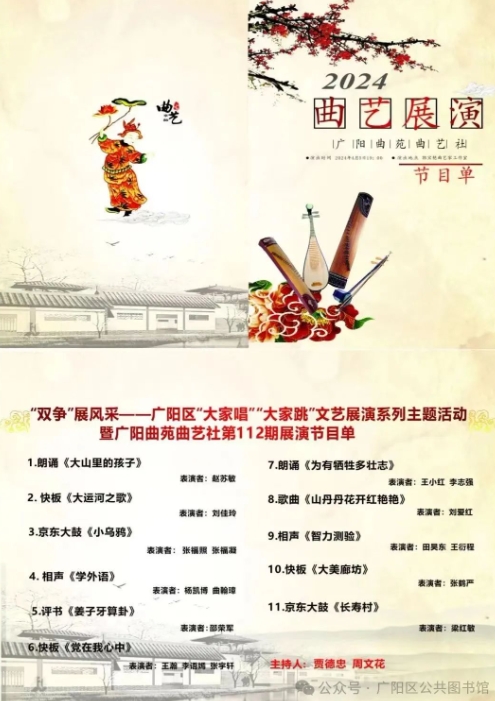 春潮已满武陵堤,花开依旧人依旧。4月5日晚7点,“‘双争’展风采——广阳区‘大家唱’’大家跳’文艺展演系列主题活动暨广阳曲苑曲艺社第112期展演”拉开帷幕。活动主办单位:廊坊市广阳区文明办、廊坊市广阳区新时代文明实践志愿服务总队;承办单位:郭宝艳曲艺家工作室、广阳曲苑曲艺社。
