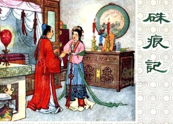 连环画《硃痕记》讲述了一个流传于唐代的民间故事。西凉节度使黄龙造反,朱春登代叔从军。朱春登婶母宋氏谋占长房的家财。宋氏内侄宋成谎称朱春登军前战死,意图谋占朱春登的妻子赵锦棠。赵氏誓死不从。不料,朱春登阵前立功,封侯归来,宋氏欺骗朱春登,称其母亲和妻子已死。朱春登痛不欲生,在坟前祭奠,并舍饭七天。恰好赵锦棠婆媳前来讨饭,因此夫妻相认,母子重逢。