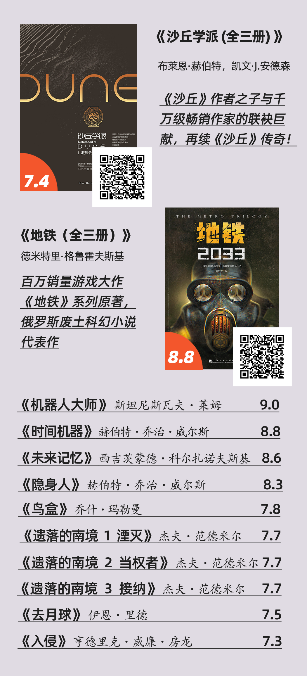 《沙丘》原作之子联手千万级畅销作家创作的传奇续章《沙丘学派》、俄罗斯废土科幻代表作《地铁》系列、开启“科幻小说诞生元年”的《时间机器》......在这里,时空摆脱束缚,宇宙联结成片,许你一场酣畅淋漓的科幻盛宴。