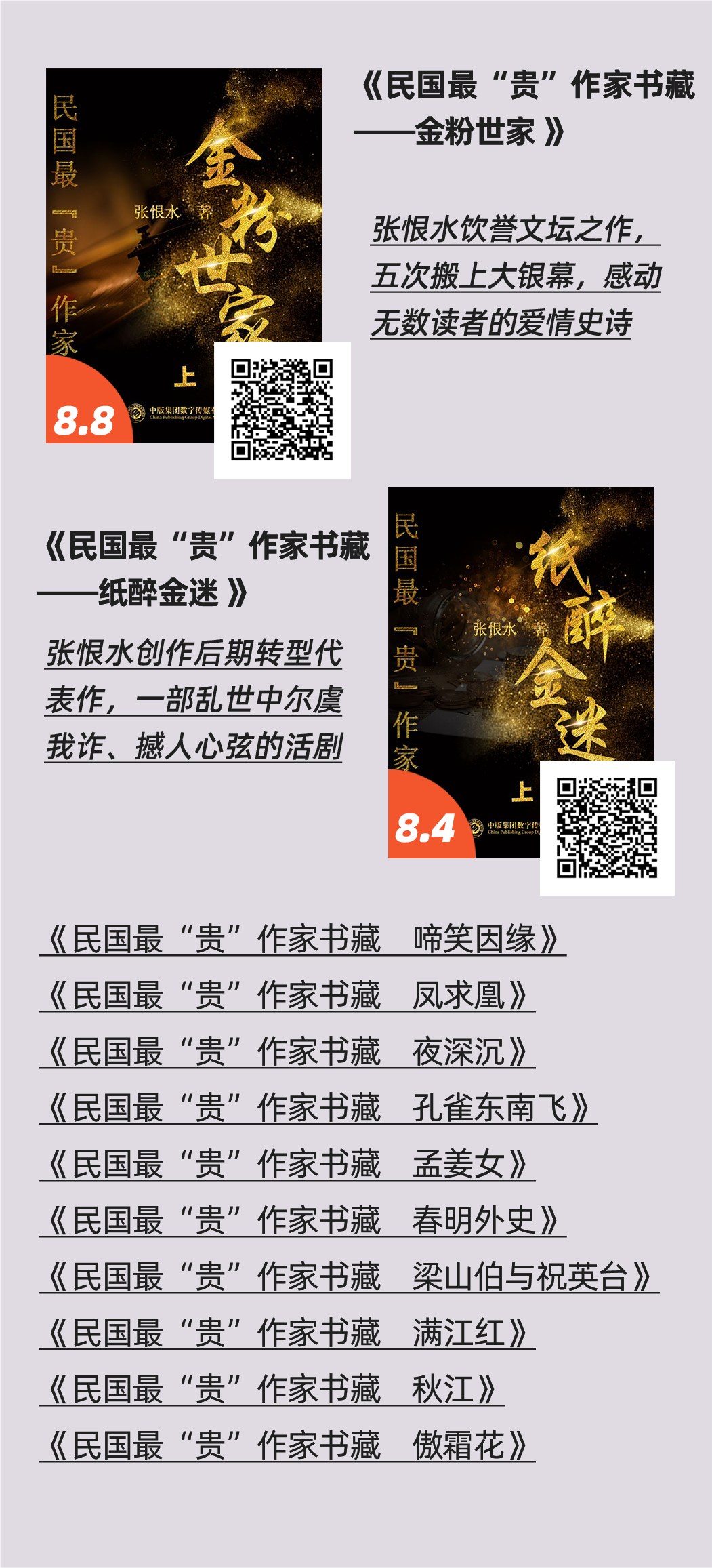 本期精选其经典名作10余册,其中不但有被称为“民国版《红楼梦》”的《金粉世家》,也有现实讽刺经典《纸醉金迷》等等,带我们在撼动心灵的笔墨中,看尽人心世态、爱恨情仇。
