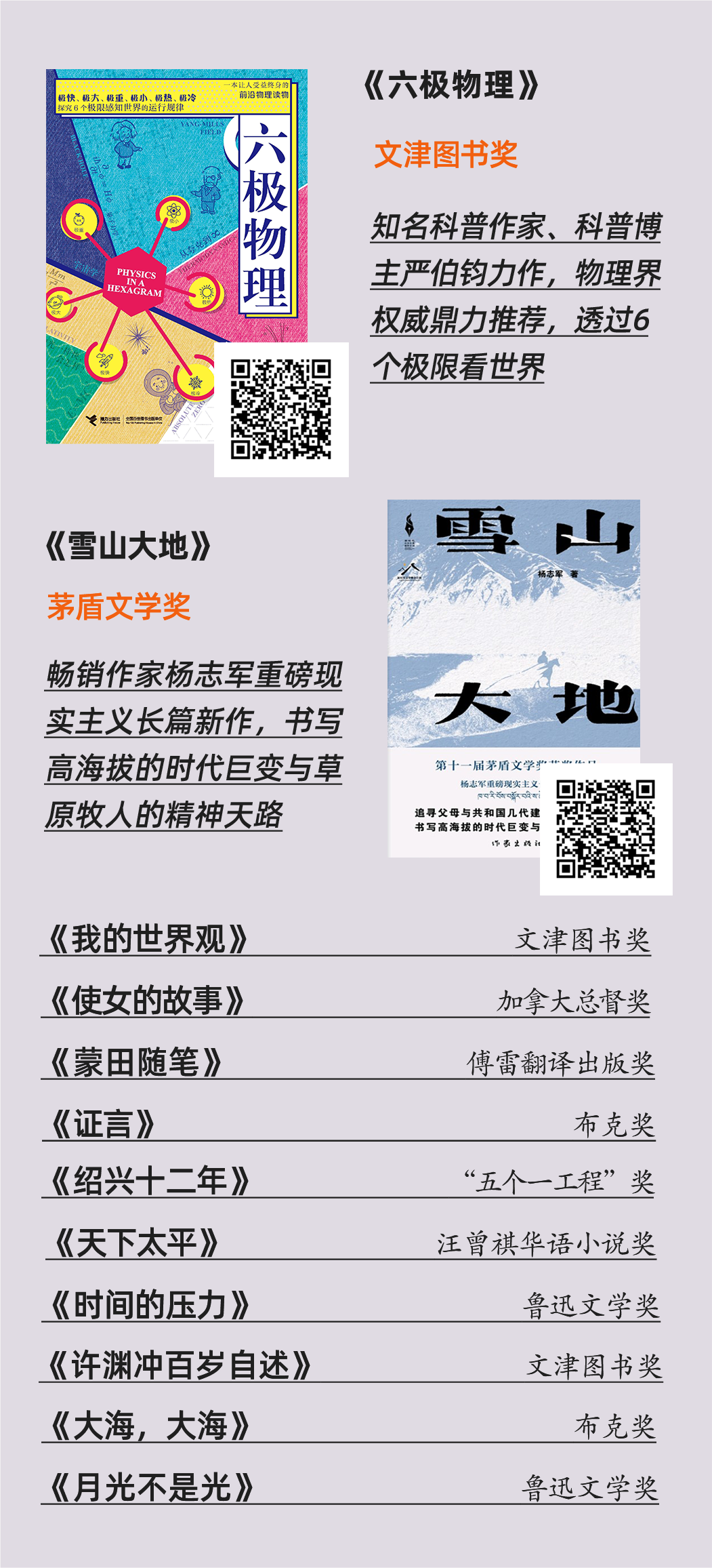 其中,既有最新茅盾文学奖作品《雪山大地》、文津图书奖作品如《六级物理》《我的世界观》,也有鲁迅文学奖作品如《时间的压力》《月光不是光》,还有布克奖、雨果奖、傅雷翻译出版奖等多项国内外文学大奖获奖作品,许你一段不会踩雷的阅读时光。