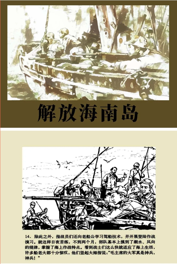 连环画《解放海南岛》根据海南岛战役改编而成,讲述了中国人民解放军为解放全中国,进行大规模的海上练兵,最终顺利登岛,解放整个海南岛的故事。