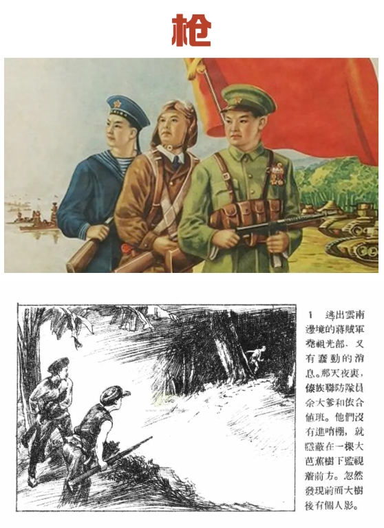 连环画《枪》讲述了云南边境地区的傣族、苗族等民族群众因为一支枪的出现增进团结、抓获匪特的故事,强调了民族团结的重要性。