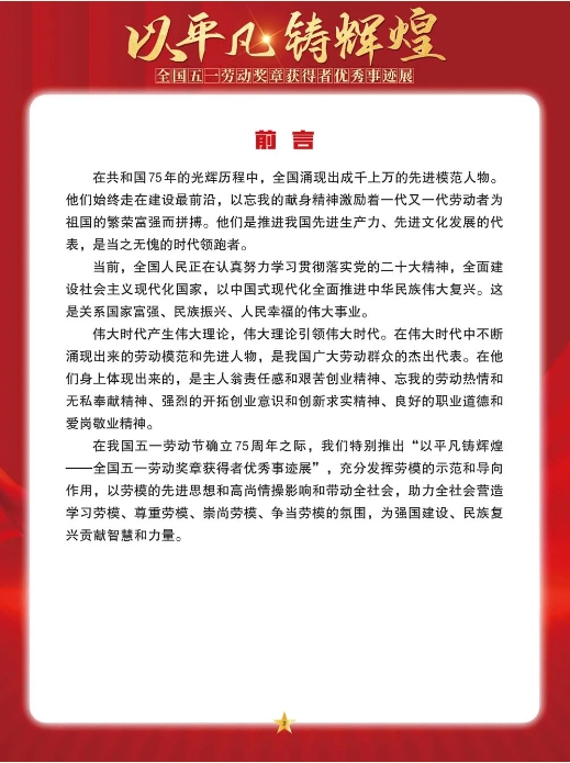 在我国五一劳动节确立75周年之际,我们特别推出“以平凡铸辉煌——全国五一劳动奖章获得者优秀事迹展”,充分发挥劳模的示范和导向作用,以劳模的先进思想和高尚情操影响和带动全社会,助力全社会营造学习劳模、尊重劳模、崇尚劳模、争当劳模的氛围,为强国建设、民族复兴贡献智慧和力量。