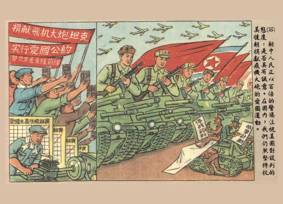 1951年7月10日,朝鲜停战谈判开启。从此,抗美援朝战争进入长达两年多的边打边谈局面。谈判过程中,美帝国主义提出了种种无理要求,不断制造障碍,又施加军事压力,妄图迫使我方接受其无理的要求。中朝方面坚持正义的立场和原则,进行了针锋相对的斗争,在谈判桌上不断揭露敌人的阴谋,并在战场上不断给予敌军打击,粉碎了敌人的军事讹诈,最后迫使美帝国主义于1953年7月27日在板门店签订停战协定。