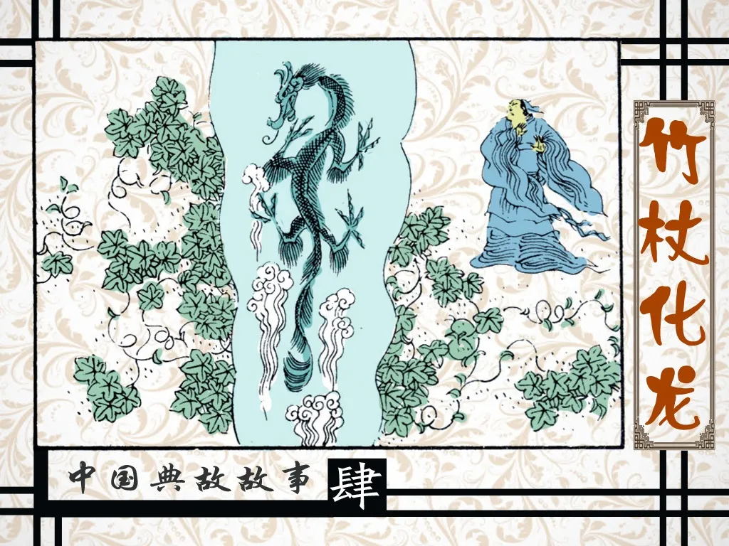 汝南人费长房任市集官吏时,发现一位卖药老人十分奇怪,卖药不准还价,又听说老人不住客栈,而是住在壶中,费长房便认定老人是有道术的高人,拜其为师学习道术。因多年未见老人传授任何法术,费长房便想回家。老人给了他一根竹杖。费长房骑着竹杖回到家后,将竹杖丢弃了,那竹杖化作一条青龙腾空而去。后以“竹杖化龙”比喻得道成仙。