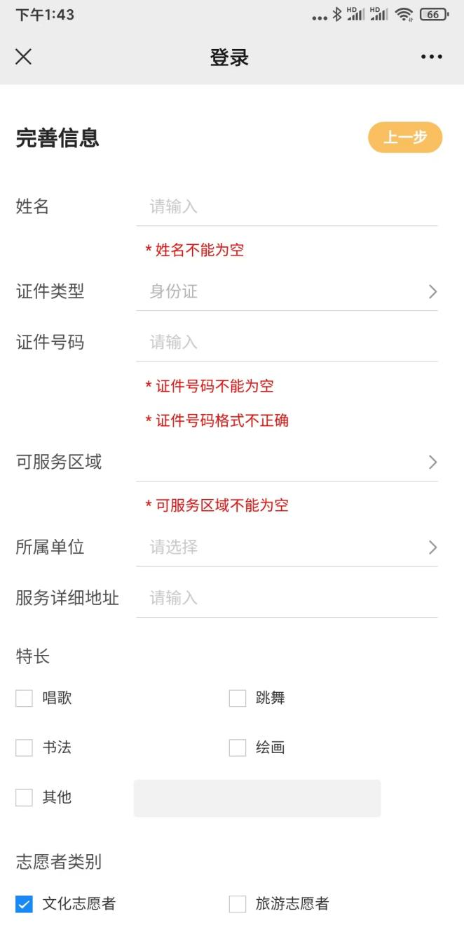 志愿者注册:进入主页面后选择右下方【个人中心】菜单,点击【个人注册】按钮,填写并完善相关信息后(志愿者类别选择“文化志愿者”),点击【提交】按钮即可。