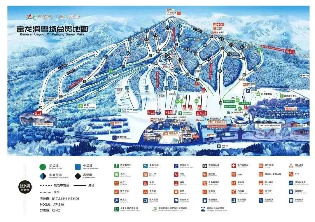 富龙滑雪场距崇礼城区仅5分钟车程,气温高一些,风也小一些。整个雪场占地面积达95万平方米,海拔低、落差高,天然的滑雪场地,雪道42条,初级/中级/高级区,魔毯、高速缆车,这些是标配,滑雪体验感更好。