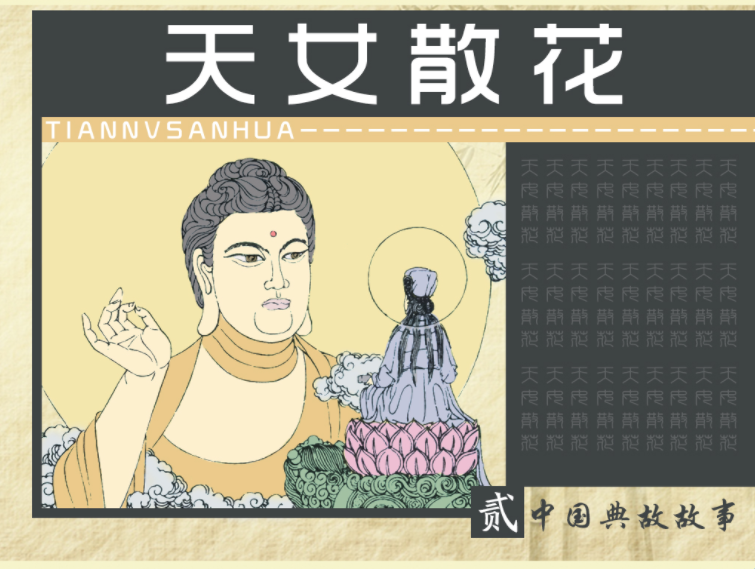 盘古临终前将百花的种子交给了花神,并传授了育花的方法。盘古去世后,花神便遵从父亲的嘱托,在天上育出了百花,美化了天庭,得到了玉帝的赞赏。为此,玉帝特意送给了花神一百位仙女,并封为百花仙子。后来,百花仙子在花神的带领下将在天上采的各种美丽的鲜花撒向人间,使人间变得更加五彩缤纷。由此便诞生了天女散花的故事。