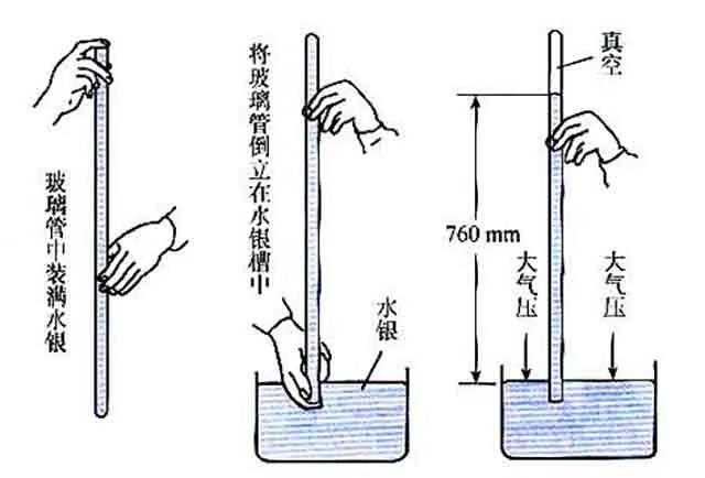为了方便研究,托里拆利用水银做实验,水银的密度比水大了14倍。他做了一根1米长的玻璃管,封住管子的一头,在里面灌满了水银。然后用手指堵住玻璃管开口,把它放到一个同样装满了水银的碗里。