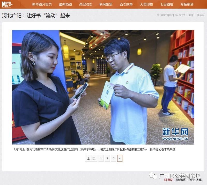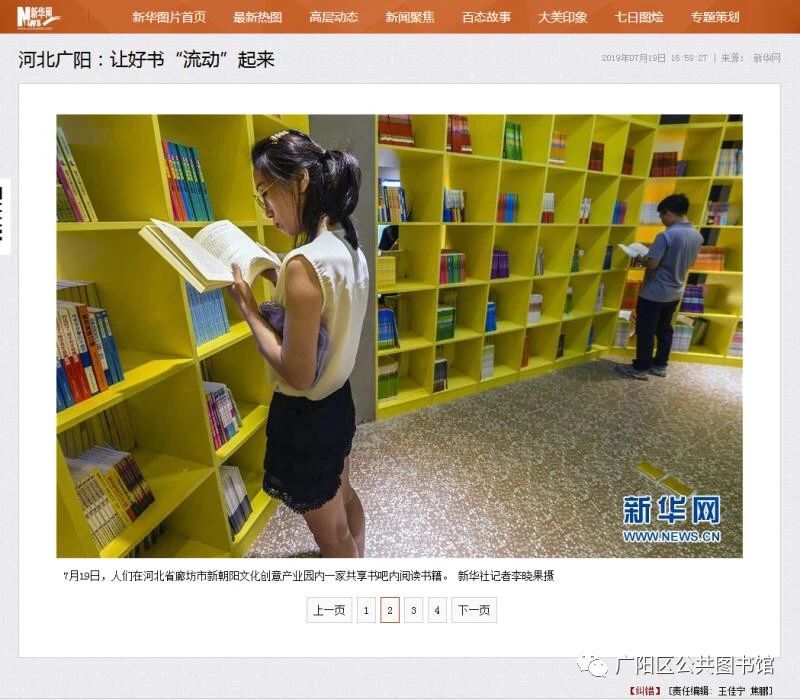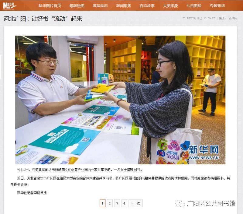 7月19日,新华网编发《河北广阳:让好书“流动”起来》图片新闻,报道广阳区图书馆与新朝阳商业综合体共建书吧开展公益阅读。